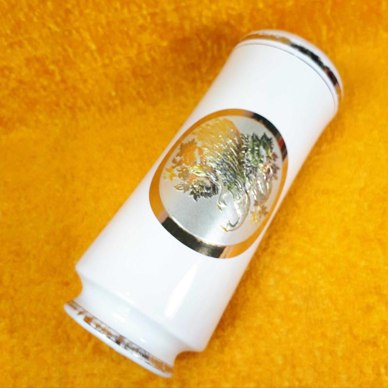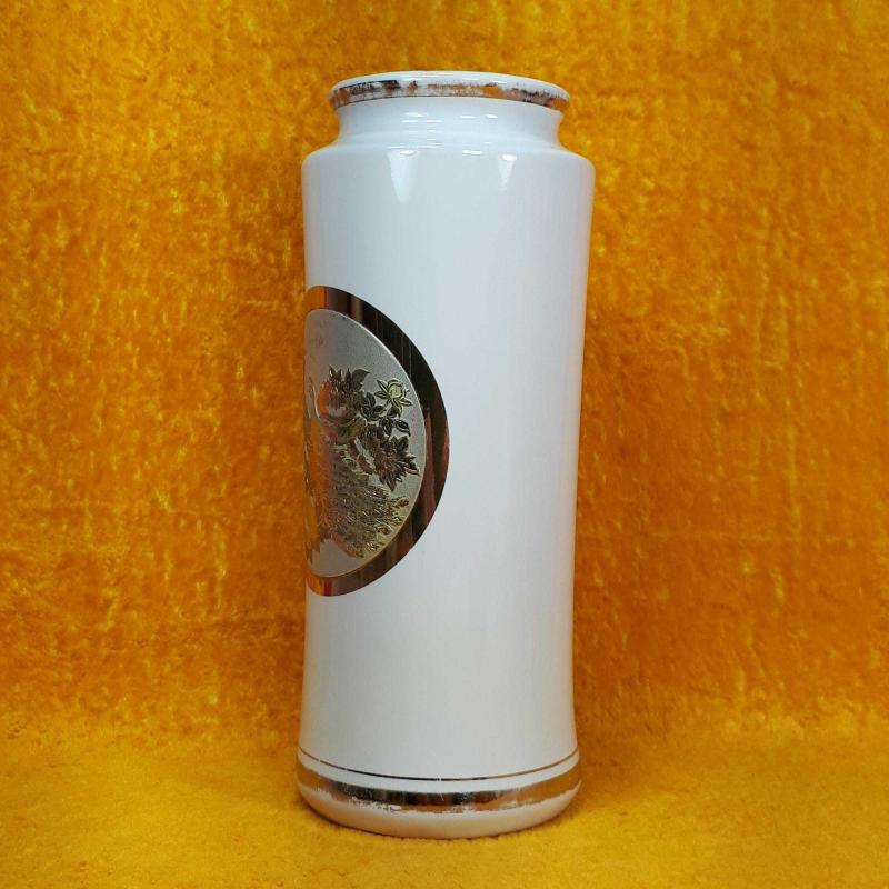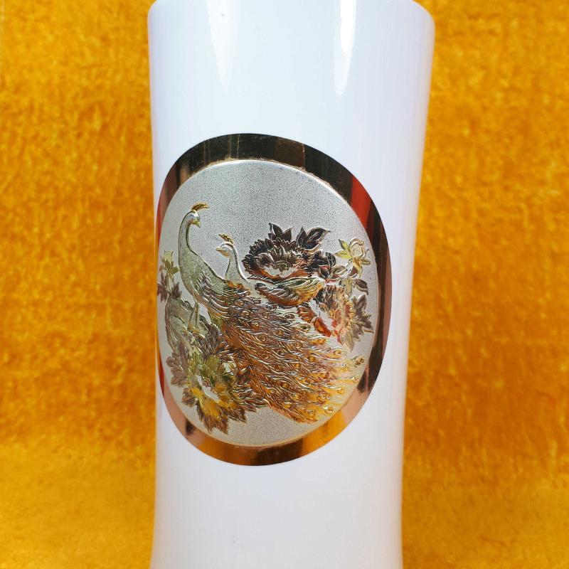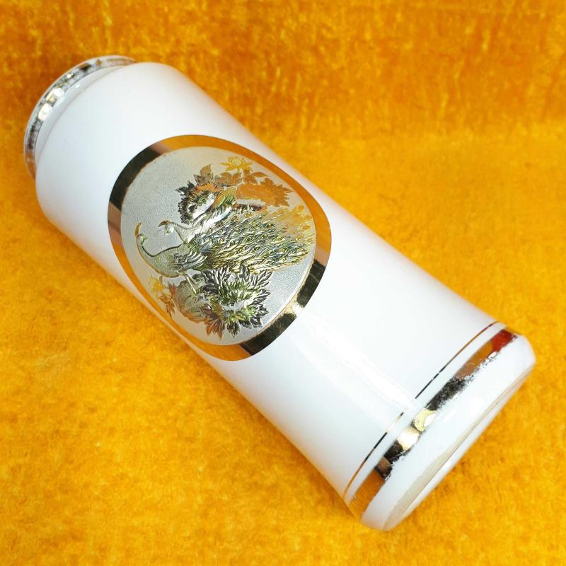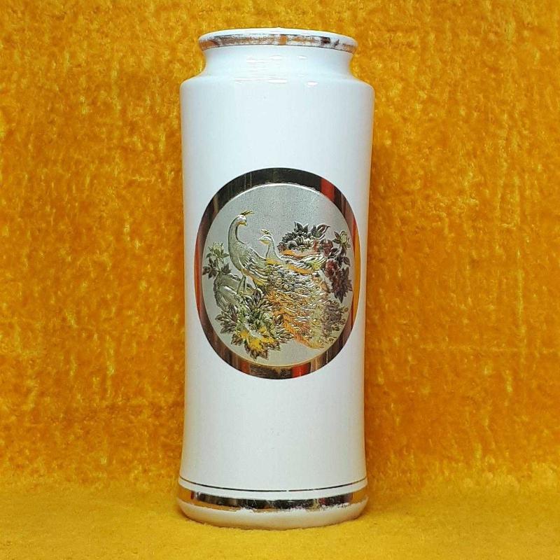 1970 LERDEN . YÜKSEKLİK 21 cm , ÇAP 8,2 cm . HAFİF KULLANIM İZLERİ VAR , KIRIK ÇATLAK YOK . ALTIN VE GÜMÜŞ YALDIZ DEKORLU TAVUSKUŞU RESİMLİ . MADE IN JAPAN .