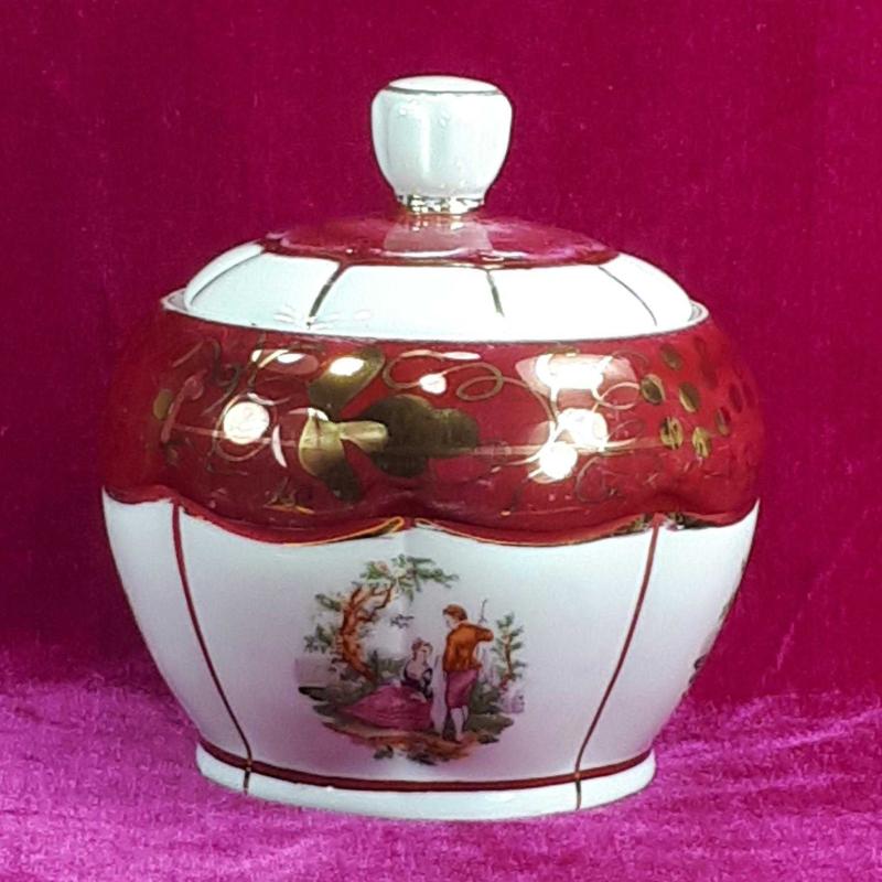 1980 LERDEN . İRAN YAPIMI , TABANDA TOOS CHINI BEST OR NONE VE SU ÜZERİNDE YÜZEN KUĞU LOGOLU . SIVAMA GERÇEK ALTIN YALDIZ EL DEKORLU VE EL BOYAMA KOYU GÜL KURUSU RENKLİ . PORTAKAL DİLİMLİ GÖVDE ÜZERİNDE 4 YERDE KLASİK FRAGONARD RESİM VAR . YÜKSEKLİK KAPAK DAHİL 11,5 cm . KUSURSUZ .