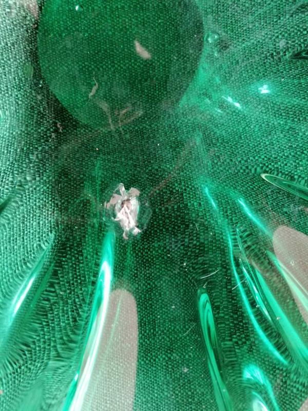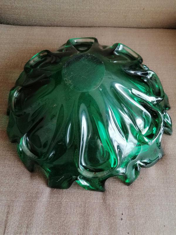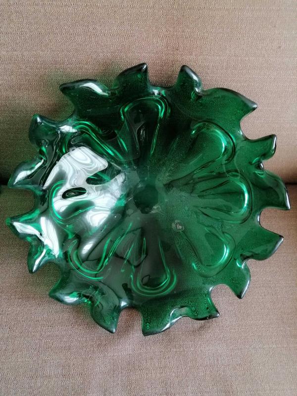 VINTAGE BÜYÜK YEŞİL MURANO CAM ŞEKERLİK ÇAP : 34.5 CM YÜKSEKLİK : 12.5 CM İÇ KISMINDA SON FOTOĞRAFTA GÖRÜLEN 1 CM BOYUTUNDA ELE KABARIK GELEN BİR DEFOSU VARDIR.