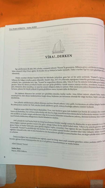 Kitap DİNÇBİLGİN tarafından yayınlanmıştır. 48 sayfadır. VİRA DEMİR GÖKOVA DERGİSİ - SADUN BORO - ÇETİN KENT - ATHAR BEŞPINAR - ODA BORO - MİÇO - DENİZ BORO - TANKUT ÖKTEM - MUSTAFA AKSOY - RAHMİ M. KOÇ - EDİP OSSA - VİRA DEMİR KİTABI - SADUN BORO’NUN DÜNYA TURU - PUPA YELKEN KİTABI - KISMET YELKENLİSİ - OKLUK KOYU DENİZ KIZI HEYKELİ - GÖKOVA VE GÜNEY EGE KIYILARININ KORUNMASI - AMATÖR DENİZCİLİK KÜLTÜRÜ - EGE SAHİLLERİ SEYİR REHBERİ - DENİZCİLİKTE YEREL İSİMLERİN KULLANIMI - LİMAN VE DEMİRLEME YERLERİ HARİTALARI - DOĞA VE DENİZ SEVGİSİ EĞİTİMİ - KIYI YAPILAŞMASINA ELEŞTİRİ - 48 SAYFA adlı eser Türkçe dilindedir.