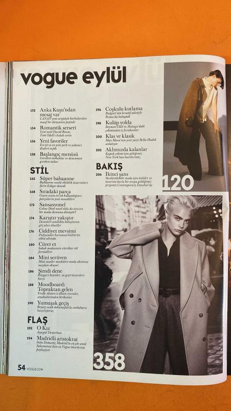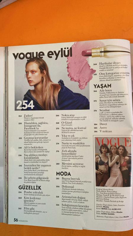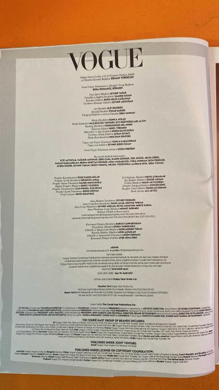 Kitap DİNÇBİLGİN tarafından yayınlanmıştır. 386 sayfadır. VOGUE DERGİSİ - EYLÜL 2017 - ALARA KOÇİBEY – ARZU SABANCI – BAŞAK DİZER – BURCU ESMERSOY – ESRA OFLAZ – NEBAHAT ÇEHRE – SEDA DOMANİÇ – CANAN – TOM ODELL – ŞİRİN EDİGER – VERDA ALATON – AYŞEGÜL DEMİRHAN – JULIA HAFSTROM – MCKENNA HELLAM – CHARLEE FRASER – BELLA HADID – CARA DELEVINGNE – ADWOA ABOAH – NATALIA VODIANOVA – ANTOINE ARNAULT – JULIA SHERMAN – JOAN JULIET BUCK – BURCU KARA – ZENEPA TURAN – JARED LETO – BENNY HORNE – KONCA AYKAN – NICK CAVE - İKİNCİ ŞANS: ÜNLÜLERİN GARDIROPLARI YENİDEN TASARIMCILARLA BULUŞUYOR – MODADA BÜYÜK SEZON AÇILIŞI – SANATTA KORKULARDAN ÖZGÜR DÜNYA: CANAN SERGİSİ – TOM ODELL İLE ROMANTİK SERSERİLİK – YENİ YERLİ-YABANCI DİZİ TAVSİYELERİ – BABANNE STİLİNDEN EKLEKTİK TASARIMLAR – CELINE DION’UN MODA DÖNÜŞÜ – PODYUMLARDA CİDDİYET MEVSİMİ – SOKAK MODASINDA CÜRET FORMÜLLERİ – “SÜPERMODELLER” EŞLİĞİNDE PRADA ÇEKİMİ – DİOR DOSYASI: “J'ADIOR”UN DÜNÜ VE BUGÜNÜ – SOSYAL MEDYADA AŞK VE GÖZLEMCİLİK – TÜRKİYE’DE HALI, ANTİKA VE MİMARİYİ GELECEĞE TAŞIYAN -386 SAYFA adlı eser Türkçe dilindedir.