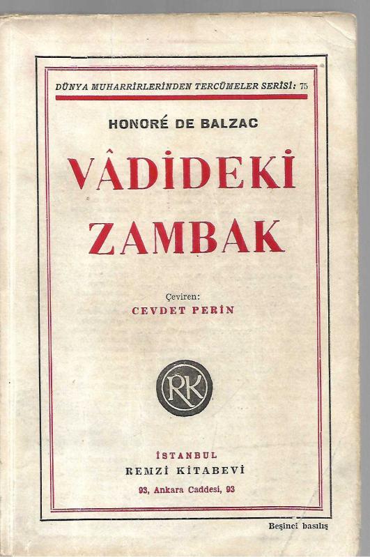 Vadideki Zambak, Honore de Balzac tarafından kaleme alınmıştır. Kitap 1961 yılında Remzi Kitabevi tarafından [İstanbul] yayınlanmıştır. Bu baskının çevirisi Cevdet Perin tarafından yapılmıştır. 336 sayfadır. Vadideki Zambak adlı eser Türkçe dilindedir.