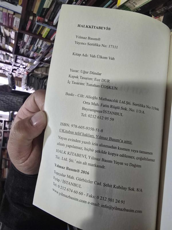 Vah Ülkem Vah!, Uğur Dündar tarafından kaleme alınmıştır. Kitap 2016 yılında Halk Kitabevi tarafından [İstanbul] yayınlanmıştır. 240 sayfadır. Vah Ülkem Vah! adlı eser Türkçe dilindedir.