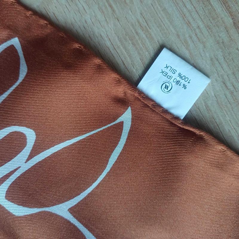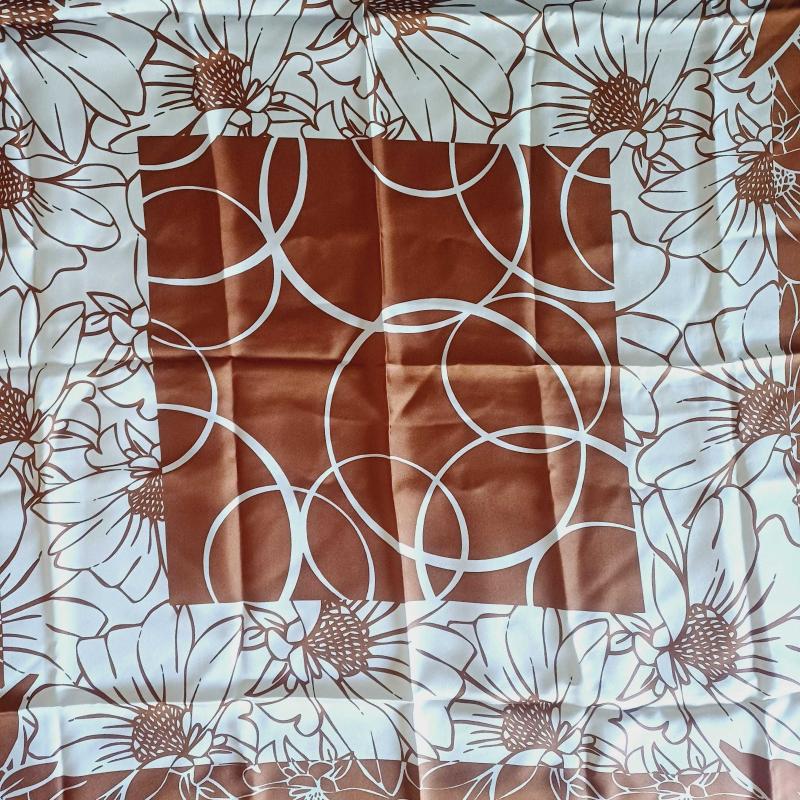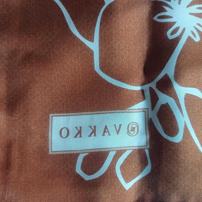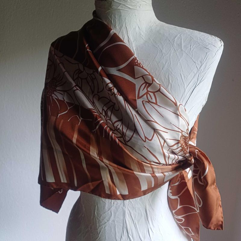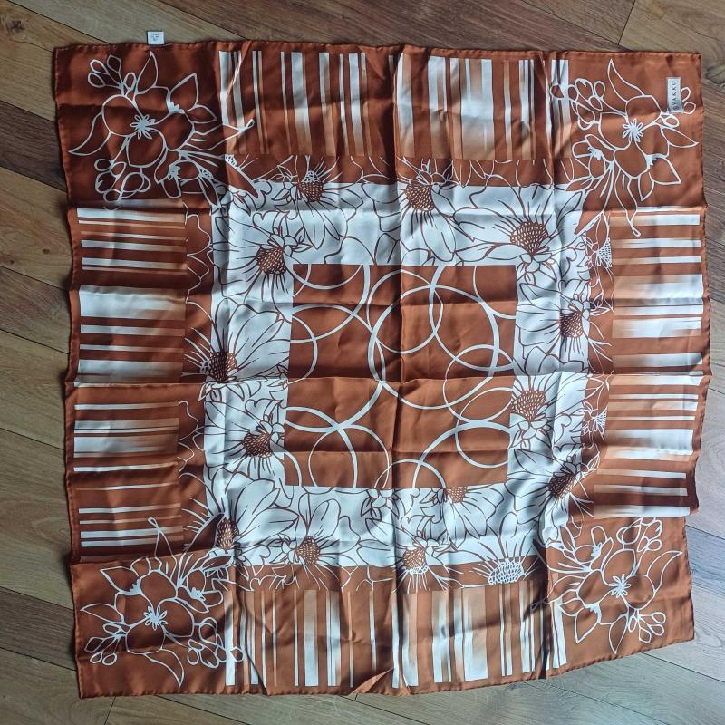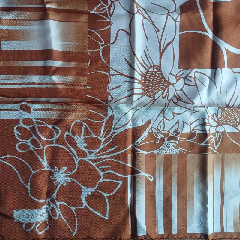 Vakko kare esarp. %100 İpek. Hic kullanilmadi. Bakır, kahve ve krem renklerde. Ortasi cicek.kenarlari geometrik desenli.