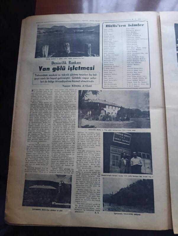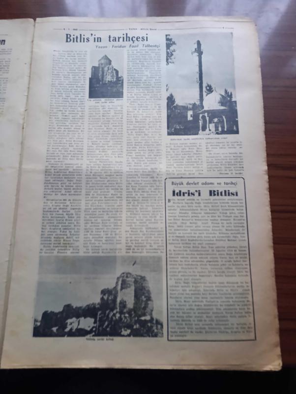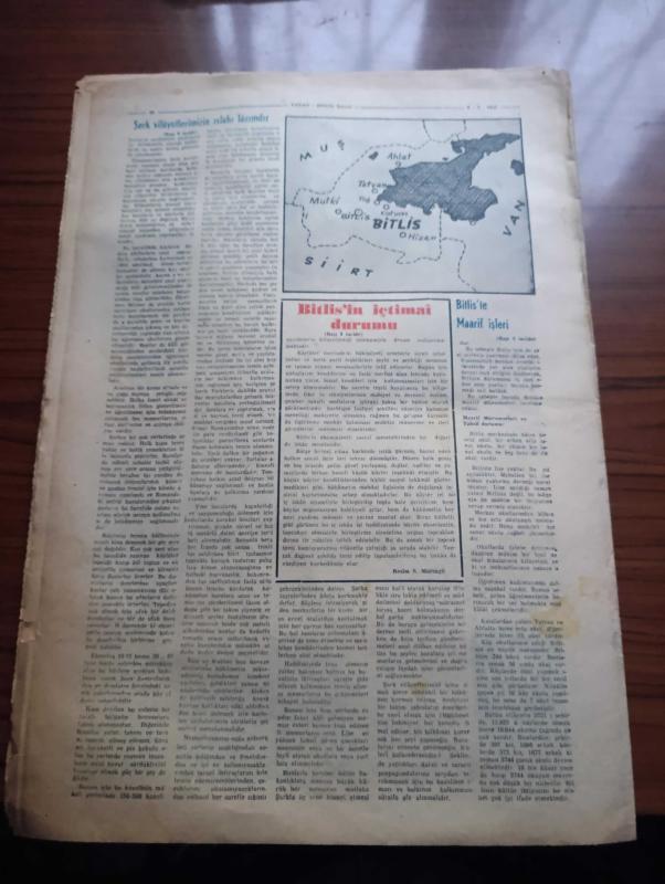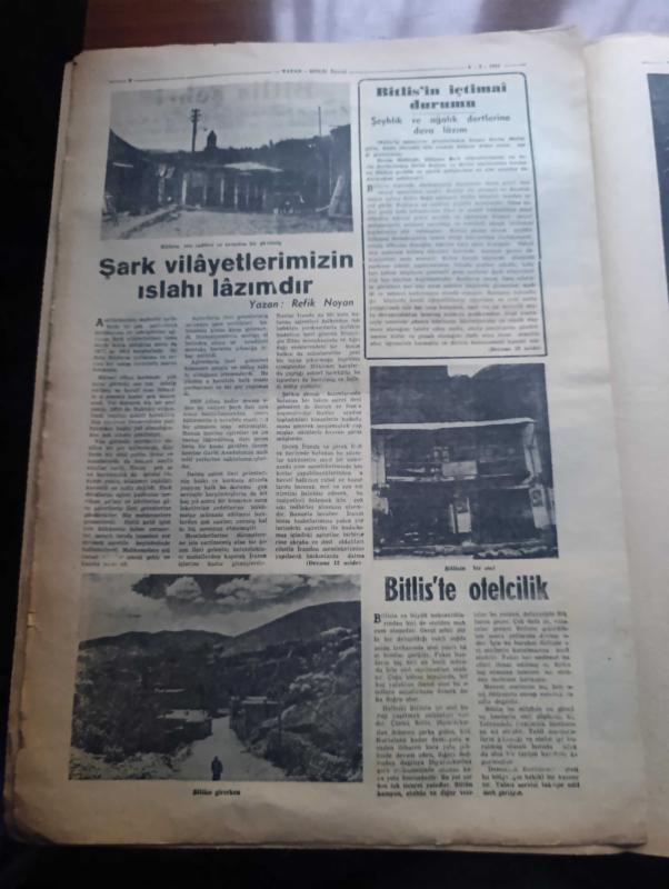 Vatan Bitlis Gazetesi - Turkish Newspaper - 8 Temmuz 1953 - Bitlis'ten bir köşe fotoğraf - Mutki Ve Hizan - Van gölü kıyılarında tabiat güzelliklerinden Reşadiye nahiyesinde bir manzara fotoğraf - göl kenarında cennet Tatvan - Bitlis'in tarihçesi yazan Feridun Fazıl Tülbentçi - büyük devlet adamı ve tarihçi İdris'i Bitlisi - Bitlis'teki tarihi eserlerden gökmeydan camii fotoğraf - Denizcilik Bankası Van gölü işletmesi Yazan Kemal Aydar - Bitlis Valisi Nadir Tüzün - Emniyet Müdürü Tevfik Doku - Bitlis Cumhuriyet savcısı Abidin Önortaç - medeniyet kervanı şark yolunda yazan Kemal Aydar - Bitlis'te maarif işleri - Bitlis'te banka işleri - Bitlis'te basın - bu dere baştan başa Ayvalı Bağ yazan Ali Saraçoğlu - Bitlis çarşısı'nda faaliyet Fotoğrafı - Şeyhlik ve ağalık dertlerine deva lazım - Şark vilayetlerimizin ıslahı lazımdır yazar Refik Noyan - nemrut dağının tepesindeki krater gölü bir tabiat harikasıdır fotoğraf - Tug'da bir köy düğünü Fotoğrafı - Hartalan Bitlis yolundaki delikli taş, Ahmet Emin Yalman tarafından kaleme alınmıştır. Vatan Bitlis Gazetesi - Turkish Newspaper - 8 Temmuz 1953 - Bitlis'ten bir köşe fotoğraf - Mutki Ve Hizan - Van gölü kıyılarında tabiat güzelliklerinden Reşadiye nahiyesinde bir manzara fotoğraf - göl kenarında cennet Tatvan - Bitlis'in tarihçesi yazan Feridun Fazıl Tülbentçi - büyük devlet adamı ve tarihçi İdris'i Bitlisi - Bitlis'teki tarihi eserlerden gökmeydan camii fotoğraf - Denizcilik Bankası Van gölü işletmesi Yazan Kemal Aydar - Bitlis Valisi Nadir Tüzün - Emniyet Müdürü Tevfik Doku - Bitlis Cumhuriyet savcısı Abidin Önortaç - medeniyet kervanı şark yolunda yazan Kemal Aydar - Bitlis'te maarif işleri - Bitlis'te banka işleri - Bitlis'te basın - bu dere baştan başa Ayvalı Bağ yazan Ali Saraçoğlu - Bitlis çarşısı'nda faaliyet Fotoğrafı - Şeyhlik ve ağalık dertlerine deva lazım - Şark vilayetlerimizin ıslahı lazımdır yazar Refik Noyan - nemrut dağının tepesindeki krater gölü bir tabiat harikasıdır fotoğraf - Tug'da bir köy düğünü Fotoğrafı - Hartalan Bitlis yolundaki delikli taş adlı eser Türkçe dilindedir.