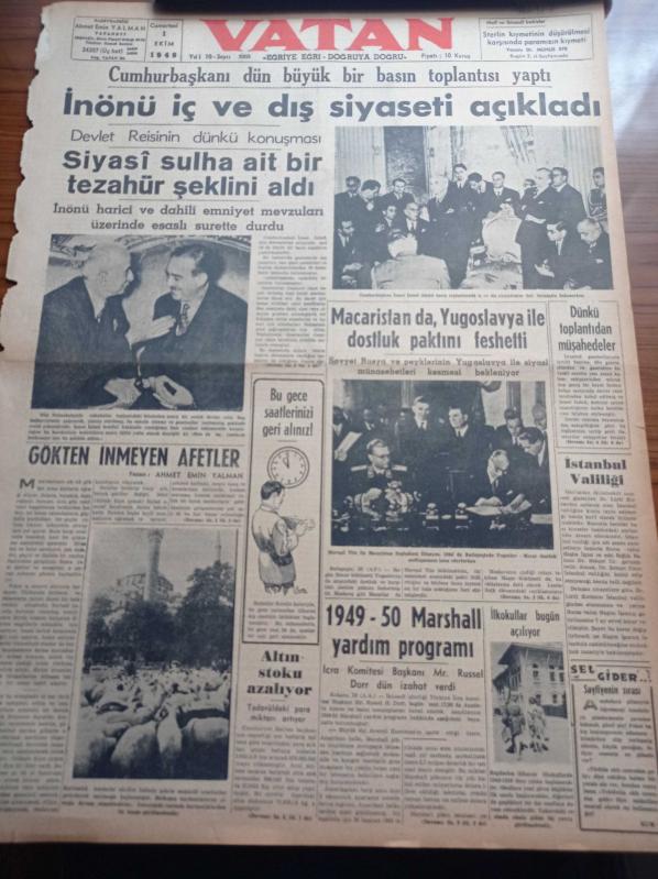 Vatan Gazetesi - 1 Ekim 1949 - Cumhurbaşkanı İsmet İnönü İç Ve Dış Siyaseti Açıkladı - Macaristan Da Yugoslavya İle Dostluk Paktını Feshetti - Gökten İnmeyen Ayetler - Doktor Lütfi Kırdar - Doktor Behçet Uz - Bursa Valisi Haşim İşcan - 1949 50 Marshall Yardım Programı- Berlin Oteli Yazan Vicki Baum Yazı Dizisi - Başbakan Şemsettin Günaltay - Altın Stoku Azalıyor - Çaykovski'nin Bir Eseri Bulundu - Atom Enerjisinin Kontrolü Müzakeresi- Atlas Sineması - Melek Sineması - Meşhur Şekerci Ali Muhiddin Hacı Bekir - Ordu Atı Şampiyonası Konkur Komple Yarışması - En Son Çıkan Türkçe Plaklar - Çapamarka - Henley Lastikleri - Meşhur Devry Sinema Makinaları, Ahmet Emin Yalman tarafından kaleme alınmıştır. Vatan Gazetesi - 1 Ekim 1949 - Cumhurbaşkanı İsmet İnönü İç Ve Dış Siyaseti Açıkladı - Macaristan Da Yugoslavya İle Dostluk Paktını Feshetti - Gökten İnmeyen Ayetler - Doktor Lütfi Kırdar - Doktor Behçet Uz - Bursa Valisi Haşim İşcan - 1949 50 Marshall Yardım Programı- Berlin Oteli Yazan Vicki Baum Yazı Dizisi - Başbakan Şemsettin Günaltay - Altın Stoku Azalıyor - Çaykovski'nin Bir Eseri Bulundu - Atom Enerjisinin Kontrolü Müzakeresi- Atlas Sineması - Melek Sineması - Meşhur Şekerci Ali Muhiddin Hacı Bekir - Ordu Atı Şampiyonası Konkur Komple Yarışması - En Son Çıkan Türkçe Plaklar - Çapamarka - Henley Lastikleri - Meşhur Devry Sinema Makinaları adlı eser Türkçe dilindedir.