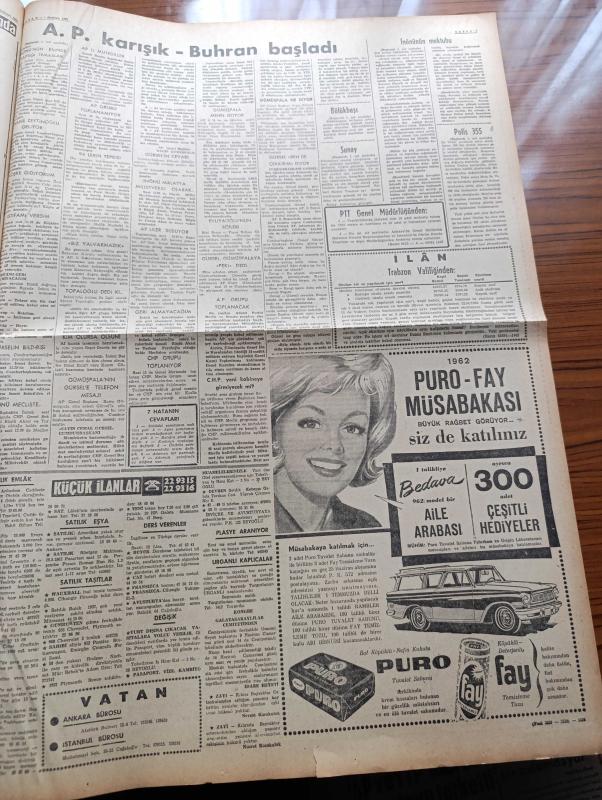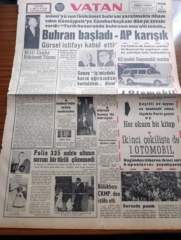 Vatan Gazetesi - 1 Haziran 1962 - Milli Cephe Hükümeti Tılsımı - Buhran Başladı Adalet Partisi Karışık - Başkan Cemal Gürsel Böyle Giderse Ben De İstifa Ederim Diyor - Genelkurmay Başkanı Orgeneral Cevdet Sunay İçimizdeki Karın Ağrısından Kurtulalım Diyor - Başbakan İsmet İnönü'nün İstifa Mektubu - Komünizm Propagandası Yaptığı Sebebiyle Yargılanan Lamia İren - Osman Bölükbaşı Cumhuriyetçi Köylü Millet Partisi'nden İstifa Etti - Füzelerimiz Birinci Oldu - Ekmeğe Zam Meselesi Yeniden Çıkmaza Girdi - Rüzgar Çelebi Çizen Guy Bara - Ünlü Fransız Sinema Sanatçısı Marie Bell İstanbul'a Geliyor - İsmet Paşa Çekilse Yazan Necdet Semizoğlu - Amerika'daki Son Buhranın Asıl Sebebi Çelik Sanayii Mi - Seylan Da Batılılara Ait Petrol Tesislerine El Koydu - Ev Kadın Moda - Üç Perdelik Cinayet Yazan Agatha Christie Yazı Dizisi - Galatasaray 3 Karagümrük 2 - Mithatpaşa Stadı - Beşiktaş Karıştı - Fenerbahçeli Eski Futbolcu Fikret Kırcan Aniden Hastalandı - Dünya Kupası Maçları Neticesi - Feriköyspor, Ahmet Emin Yalman tarafından kaleme alınmıştır. Vatan Gazetesi - 1 Haziran 1962 - Milli Cephe Hükümeti Tılsımı - Buhran Başladı Adalet Partisi Karışık - Başkan Cemal Gürsel Böyle Giderse Ben De İstifa Ederim Diyor - Genelkurmay Başkanı Orgeneral Cevdet Sunay İçimizdeki Karın Ağrısından Kurtulalım Diyor - Başbakan İsmet İnönü'nün İstifa Mektubu - Komünizm Propagandası Yaptığı Sebebiyle Yargılanan Lamia İren - Osman Bölükbaşı Cumhuriyetçi Köylü Millet Partisi'nden İstifa Etti - Füzelerimiz Birinci Oldu - Ekmeğe Zam Meselesi Yeniden Çıkmaza Girdi - Rüzgar Çelebi Çizen Guy Bara - Ünlü Fransız Sinema Sanatçısı Marie Bell İstanbul'a Geliyor - İsmet Paşa Çekilse Yazan Necdet Semizoğlu - Amerika'daki Son Buhranın Asıl Sebebi Çelik Sanayii Mi - Seylan Da Batılılara Ait Petrol Tesislerine El Koydu - Ev Kadın Moda - Üç Perdelik Cinayet Yazan Agatha Christie Yazı Dizisi - Galatasaray 3 Karagümrük 2 - Mithatpaşa Stadı - Beşiktaş Karıştı - Fenerbahçeli Eski Futbolcu Fikret Kırcan Aniden Hastalandı - Dünya Kupası Maçları Neticesi - Feriköyspor adlı eser Türkçe dilindedir.