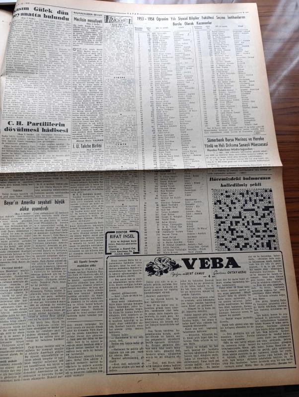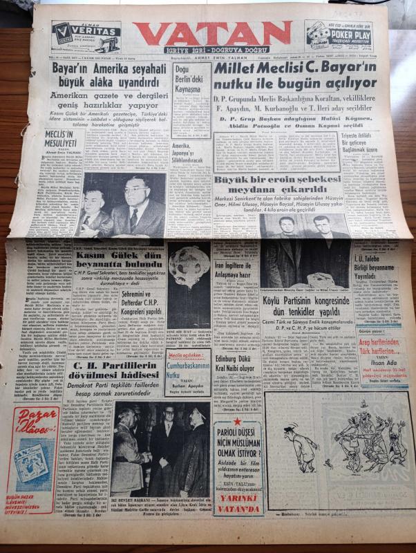Vatan Gazetesi - 1 Kasım 1953 - Meclis'in Mesuliyeti Yazan Ahmet Emin Yalman Köşe Yazısı - Celal Bayar'ın Amerika Seyahati Büyük Alaka Uyandırdı - Kasım Gülek Dün Beyanatta Bulundu - Cumhuriyet Halk Parti'lilerin Dövülmesi Hadisesi - Amerika Japonya'yı Silahlandıracak - Doğu Berlin'deki Kaynaşma - Millet Meclisi Celal Bayar'ın Nutku İle Bugün Açılıyor - Büyük Bir Eroin Şebekesi Meydana Çıkarıldı - İstanbul Üniversitesi Talebe Birliği Beyanname Yayınladı - Edinburg Dükü Kral Naibi Oluyor - Yeşil Gözlü Soledad Yazan Greta Granor Yazı Dizisi - Arap Harflerinden Türk Harflerine Yazan İhsan Ada - 10 Kasım Töreni İçin Hazırlıklar Devam Ediyor - İstanbul Liselilerin Lokali Açıldı - İran İngiltere İle Anlaşmaya Hazır - Eski Mısır Kralı Faruk Düelloya Davet Edildi - Veba Yazan Albert Camus Yazı Dizisi - İstanbul Kapılarında Fethin Büyük Tarihî Romanı Yazan Feridun Fazıl Tülbentçi Yazı Dizisi - Gripin - Kısa İlanlar - İstanbul Ankara İzmir Radyosu Programı - 1953 1954 Öğrenim Yılı - Ali Sipahi adlı eser, Kitap > Süreli Yayınlar > Gazeteler > Türkiye > Genel > Günlük kategorisinde İkinci El olarak satıştadır.