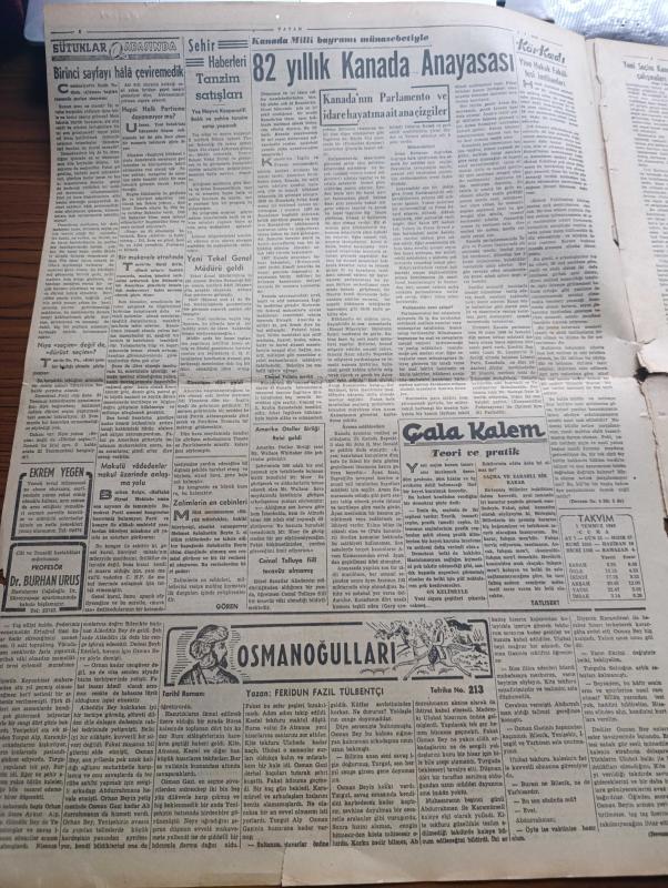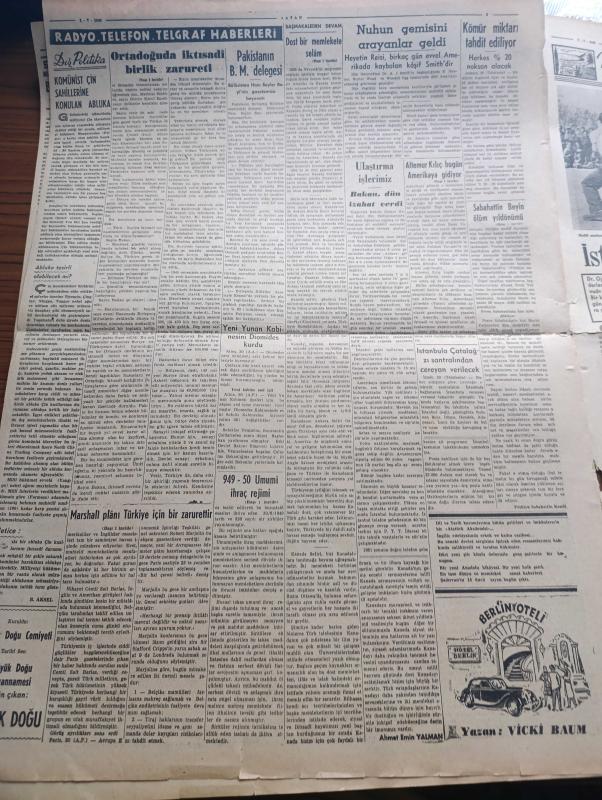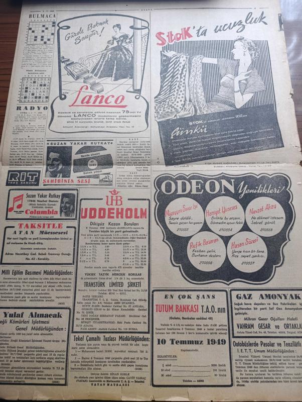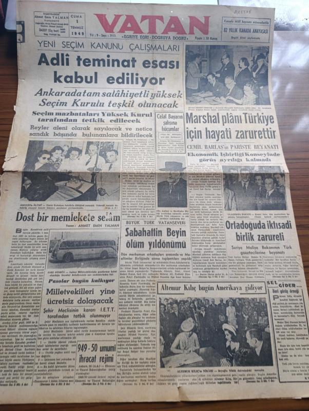 Vatan Gazetesi - 1 Temmuz 1949 - Yeni Seçim Kanunu Çalışmaları - Dost Bir Memlekete Selam Yazan Ahmet Emin Yalman Köşe Yazısı - Adli Teminat Esası Kabul Ediliyor - Büyük Türk Vatanseveri Prens Sabahattin Beyin Ölüm Yıldönümü - Pasolar Bugün Kalkıyor Milletvekilleri Yine Ücretsiz Dolaşacak - Cemil Barlas'ın Paris'te Beyanatı - Kanada Milli Bayramı Münasebetiyle 82 Yıllık Kanada Anayasası - Osmanoğulları Yazan Feridun Fazıl Tülbentçi Yazı Dizisi - Yeni Tekel Müdürü Hadi Hüsman Geldi - Amerika Otelleri Birliği Reisi Wallace Whittaker Geldi - Ankara İstanbul Boks Birincilikleri - Türkiye Tenis Birincilikleri - Nuh'un Gemisini Arayanlar Geldi - Heyetin Tesisi Birkaç Gün Evvel Amerika'da Kaybolan Kaşif Smith'dir - Komünist Çin Sahillerine Konulan Abluka - Bugünkü İsrail Yazan Sinan Korle Yazı Dizisi - Stok Kumaşları - Lanco Saatleri - Bulmaca - İstanbul Radyosu Programı - Suzan Yakar Rutkay Nasihat Destanı Plak adlı eser, Kitap > Süreli Yayınlar > Gazeteler > Türkiye > Genel > Günlük kategorisinde İkinci El olarak satıştadır.