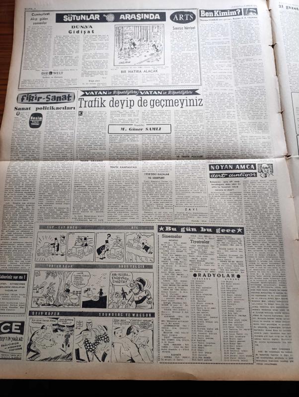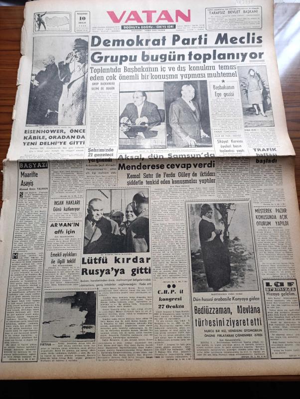 Vatan Gazetesi - 10 Aralık 1959 - Demokrat Parti Meclis Grubu Bugün Toplanıyor - CHP Genel Sekreteri İsmail Rüştü Aksal Dün Samsun'da Adnan Menderes'e Cevap Verdi - Amerikan Başkanı Eisenhower Önce Kabile Oradan Da Delhi'ye Gitti - Sağlık Bakanı Lütfi Kırdar Rusya'ya Gitti - Emekli Aylıkları İle İlgili Teklif - Bediüzzaman Saidi Nursi Mevlana Türbesini Ziyaret Etti - Şikayet Kervanı Üyeleri - Duru Göl Yazan İlhan Tarus Yazı Dizisi - 84 Doktor Gece Nöbeti Tutmayı Kabul Etti - Ben Artık Farah Diba Değilim Hayatım Tamamen Şaha Aittir - Yörük Mutfak Margarini - Politika Ve Ötesi Yazan Sadun Tanju - Ben Kimim Yazan Theresa Charles Yazı Dizisi - Fikir Sanat Yazan Yaşar Yeniçeli - Lüp Lüp Amca Çizgi Roman - Tonton Agah Çizgi Roman Sade Yalçın - Stiv Roper Çizen Saundes Ve Waggon - Fenerbahçe Nice Maçının Yeri Bugün Belli Oluyor - Fenerbahçeli Seracettin'e Bir Ay Müsabaka Yok - Galatasaray Bu Sabah İzmir'e Gidiyor - Feriköy Vefa'yı da Dize Getirdi - Finlandiya Roma Olimpiyatlarına Katılacak, Ahmet Emin Yalman tarafından kaleme alınmıştır. Vatan Gazetesi - 10 Aralık 1959 - Demokrat Parti Meclis Grubu Bugün Toplanıyor - CHP Genel Sekreteri İsmail Rüştü Aksal Dün Samsun'da Adnan Menderes'e Cevap Verdi - Amerikan Başkanı Eisenhower Önce Kabile Oradan Da Delhi'ye Gitti - Sağlık Bakanı Lütfi Kırdar Rusya'ya Gitti - Emekli Aylıkları İle İlgili Teklif - Bediüzzaman Saidi Nursi Mevlana Türbesini Ziyaret Etti - Şikayet Kervanı Üyeleri - Duru Göl Yazan İlhan Tarus Yazı Dizisi - 84 Doktor Gece Nöbeti Tutmayı Kabul Etti - Ben Artık Farah Diba Değilim Hayatım Tamamen Şaha Aittir - Yörük Mutfak Margarini - Politika Ve Ötesi Yazan Sadun Tanju - Ben Kimim Yazan Theresa Charles Yazı Dizisi - Fikir Sanat Yazan Yaşar Yeniçeli - Lüp Lüp Amca Çizgi Roman - Tonton Agah Çizgi Roman Sade Yalçın - Stiv Roper Çizen Saundes Ve Waggon - Fenerbahçe Nice Maçının Yeri Bugün Belli Oluyor - Fenerbahçeli Seracettin'e Bir Ay Müsabaka Yok - Galatasaray Bu Sabah İzmir'e Gidiyor - Feriköy Vefa'yı da Dize Getirdi - Finlandiya Roma Olimpiyatlarına Katılacak adlı eser Türkçe dilindedir.
