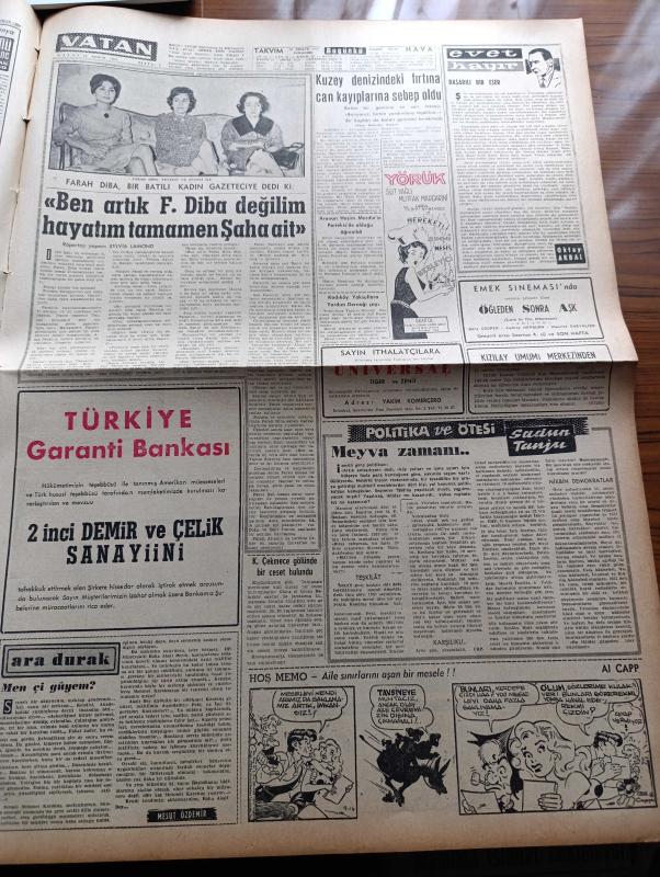 Vatan Gazetesi - 10 Aralık 1959 - Demokrat Parti Meclis Grubu Bugün Toplanıyor - CHP Genel Sekreteri İsmail Rüştü Aksal Dün Samsun'da Adnan Menderes'e Cevap Verdi - Amerikan Başkanı Eisenhower Önce Kabile Oradan Da Delhi'ye Gitti - Sağlık Bakanı Lütfi Kırdar Rusya'ya Gitti - Emekli Aylıkları İle İlgili Teklif - Bediüzzaman Saidi Nursi Mevlana Türbesini Ziyaret Etti - Şikayet Kervanı Üyeleri - Duru Göl Yazan İlhan Tarus Yazı Dizisi - 84 Doktor Gece Nöbeti Tutmayı Kabul Etti - Ben Artık Farah Diba Değilim Hayatım Tamamen Şaha Aittir - Yörük Mutfak Margarini - Politika Ve Ötesi Yazan Sadun Tanju - Ben Kimim Yazan Theresa Charles Yazı Dizisi - Fikir Sanat Yazan Yaşar Yeniçeli - Lüp Lüp Amca Çizgi Roman - Tonton Agah Çizgi Roman Sade Yalçın - Stiv Roper Çizen Saundes Ve Waggon - Fenerbahçe Nice Maçının Yeri Bugün Belli Oluyor - Fenerbahçeli Seracettin'e Bir Ay Müsabaka Yok - Galatasaray Bu Sabah İzmir'e Gidiyor - Feriköy Vefa'yı da Dize Getirdi - Finlandiya Roma Olimpiyatlarına Katılacak adlı eser, Kitap > Süreli Yayınlar > Gazeteler > Türkiye > Genel > Günlük kategorisinde İkinci El olarak satıştadır.