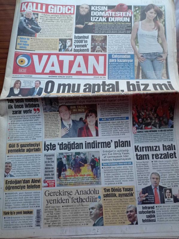 Vatan Gazetesi - 10 Aralık 2007 - Galatasaray'da Kalli Gidici - Nefise Karatay Çalışmadan Para Kazanıyor - Metrocity'nin Ortağı Onur Ağım Cezadan Kurtulmak İçin Hukuki İşlem Yapmaya Doğuştan Yetersiz Diye Mahkemeden Karar Çıkarttı - Recep Tayyip Erdoğan'dan Alevi Öğrenciye Telefon - Pişmanlık Yasası Ya Da Eve Dönüş adlı eser Türkçe dilindedir.