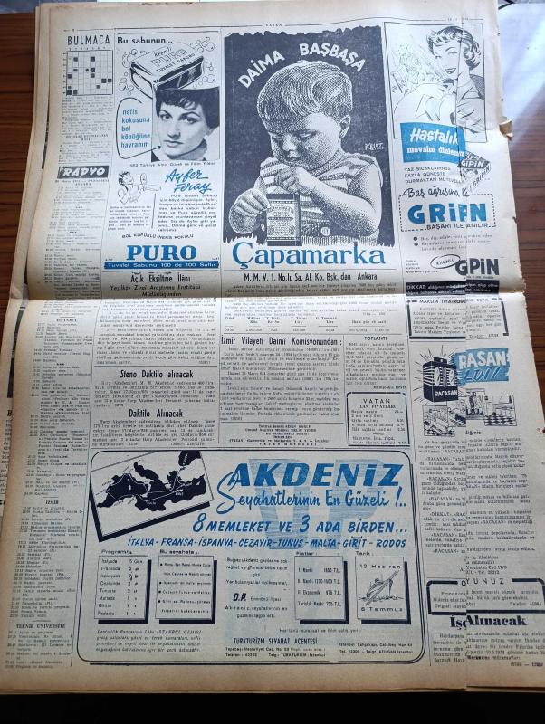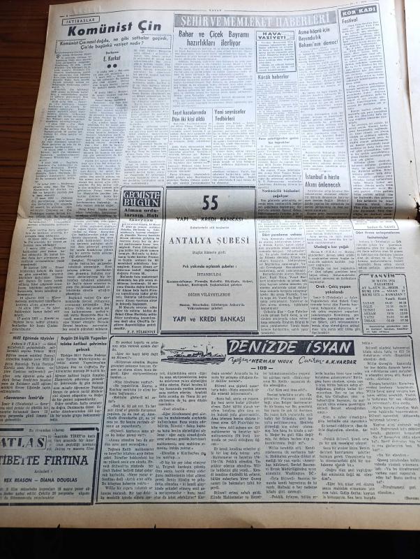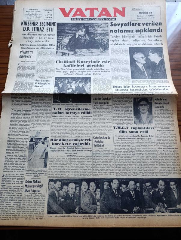 Vatan Gazetesi - 10 Mayıs 1954 - Ahmet Emin Yalman Köşe Yazısı - Kırşehir Seçimine Demokrat Parti İtiraz Etti - Çin Hindi Kuzeyinde Esir Kafileleri Görüldü - Amerikalı Tanınmış İnşaatçı Harry Morrison Seyhan Barajını İnceliyor - Kıbrıs Türkleri Muhtariyet Değil İlhak İstiyor - Teknik Okul Öğrencilerine Sabır Tavsiye Edildi - Sovyetler Birliğine Verilen Notamız Açıklandı - Başbakan Adnan Menderes Gazetecilere Ziyafet Verdi - Denizde İsyan Yazan Herman Wouk Yazı Dizisi - İstanbul'a Hasta Akını Önlenecek - Fotoğraflarla Haberler - General Ali Fuat Cebesoy'un Siyasi Hatıraları Yazı Dizisi - Büyük Bir Operet Bestekarı Emmerich Kalman - Ramazan Geceleri Karagöz - Jigolo Yazan Daniel Harper Yazı Dizisi - Galatasaray Beşiktaş'ı Dün 3 0 Mağlup Etti - Serbest Güreş Müsabakaları - Bahar Kupası Atletizm Yarışmaları - Şişli Terakki Lisesi'nin 75. Yıldönümü - Ayfer Feray Puro Tuvalet Sabunu Kullanıyorum Diyor - Çapamarka - Gripin - Ankara İstanbul İzmir Radyosu Programı - Bulmaca -T.M.G.T Toplantısı adlı eser, Kitap > Süreli Yayınlar > Gazeteler > Türkiye > Genel > Günlük kategorisinde İkinci El olarak satıştadır.