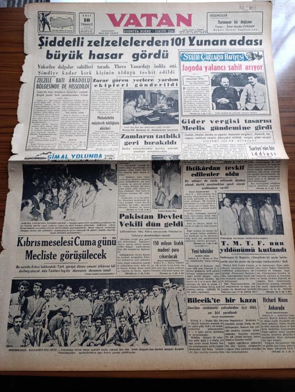 Vatan Gazetesi - 10 Temmuz 1956 - Şiddetli Zelzelelerden 101 Yunan Adası Büyük Hasar Gördü - Stalin Çarların Hafiyesi İfşaatı Yapan Alexander Orlov Yazı Dizisi - Ege Bölgesindeki Depremde İzmir'de Bazı Evlerin Duvarları Çatladı - Zamların Tatbiki Geri Bırakıldı - Gider Vergisi Tasarısı Meclis Gündemine Girdi - Kıbrıs Meselesi Cuma Günü Meclis'te Görüşülecek - Türkiye Milli Talebe Federasyonu'nun Yıldönümü Kutlandı - Amerikan Cumhurreisi Muavini Richard Nixon Ankara'da - İstanbul'un En Eski Süpürge ısı Madam Rebeka - Akşam Gazetesi İdare Müdürü Nazım Dersan'ın Cenazesi Kaldırıldı - Madem İşçileri 6 Ay Askerlik Yapacak - Hoş Memo Karikatür - General Ali Fuat Cebesoy'un Siyasi Hatıraları Yazı Dizisi - Cimcimeler Karikatür - Ella Sinders Karikatür - Marlene Dietrich - Galatasaray İngiliz Antrenörü George Dick İle Anlaştı - Adaletli Selahattin Ve B. Erol Fenerbahçe'ye Girmek İstiyor, Ahmet Emin Yalman tarafından kaleme alınmıştır. Vatan Gazetesi - 10 Temmuz 1956 - Şiddetli Zelzelelerden 101 Yunan Adası Büyük Hasar Gördü - Stalin Çarların Hafiyesi İfşaatı Yapan Alexander Orlov Yazı Dizisi - Ege Bölgesindeki Depremde İzmir'de Bazı Evlerin Duvarları Çatladı - Zamların Tatbiki Geri Bırakıldı - Gider Vergisi Tasarısı Meclis Gündemine Girdi - Kıbrıs Meselesi Cuma Günü Meclis'te Görüşülecek - Türkiye Milli Talebe Federasyonu'nun Yıldönümü Kutlandı - Amerikan Cumhurreisi Muavini Richard Nixon Ankara'da - İstanbul'un En Eski Süpürge ısı Madam Rebeka - Akşam Gazetesi İdare Müdürü Nazım Dersan'ın Cenazesi Kaldırıldı - Madem İşçileri 6 Ay Askerlik Yapacak - Hoş Memo Karikatür - General Ali Fuat Cebesoy'un Siyasi Hatıraları Yazı Dizisi - Cimcimeler Karikatür - Ella Sinders Karikatür - Marlene Dietrich - Galatasaray İngiliz Antrenörü George Dick İle Anlaştı - Adaletli Selahattin Ve B. Erol Fenerbahçe'ye Girmek İstiyor adlı eser Türkçe dilindedir.