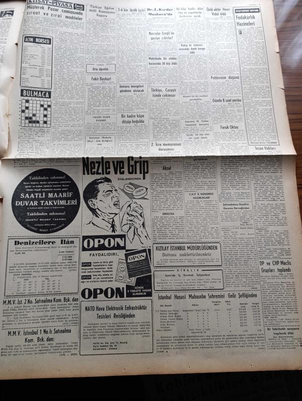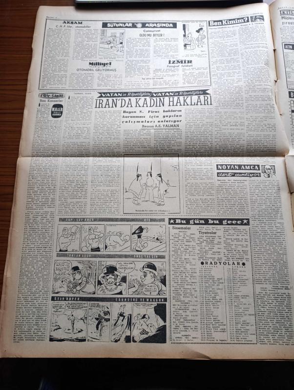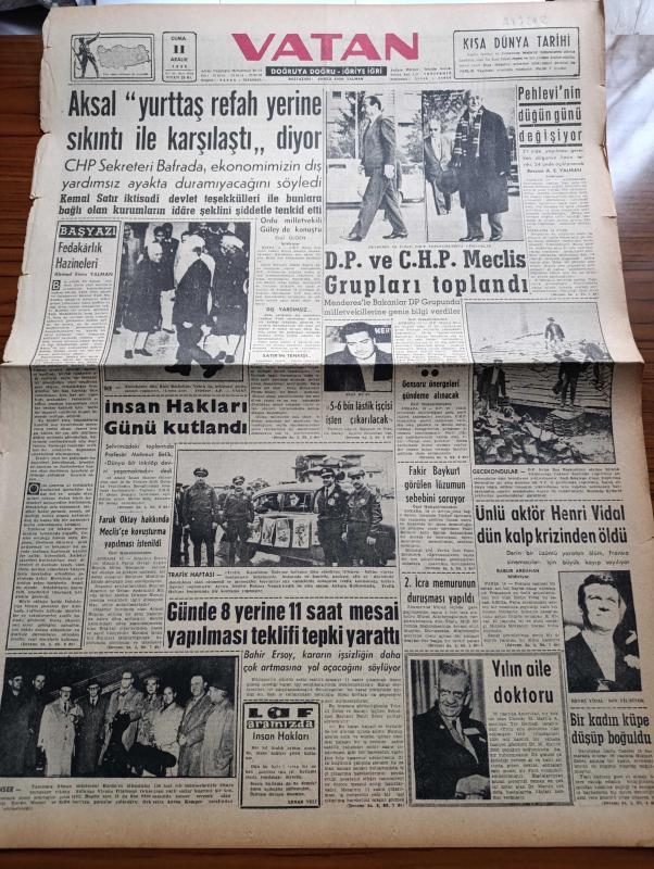 Vatan Gazetesi - 11 Aralık 1959 - Ahmed Emin Yalman Köşe Yazısı - CHP Genel Sekreteri İsmail Rüştü Aksal Yurttaş Refah Yerine Sıkıntı İle Karşılaştı Diyor - İnsan Hakları Günü Kutlandı - Günde 8 Yerine 11 Saat Mesai Yapılması Teklifi Tepki Yarattı - Ünlü Aktör Henri Vidal Dün Kalp Krizinden Öldü - Fakir Baykurt Öğretmenlikten Menedilmesinin Sebebini Soruyor - İran Şahı Rıza Pehlevi'nin Düğün Günü Değişiyor - He Kahvesi Yazan Abdullah Aşçı Yazı Dizisi - Kara Çarşaf Dün Yine Hakim Önüne Çıktı - Dağa Çıkmış Şakiler Birer Birer Yakalanıyor - Hoş Memo Karikatür - Naim Tirali Köşe Yazısı - İran'da Kadın Hakları Yazan Rezzan A. E. Yalman - Ben Kimim Yazan Theresa Charles Yazı Dizisi - Lüp Lüp Amca Çizgi Roman - Tonton Agah Çizgi Roman Sade Yalçın - Stiv Roper Çizen Saundes Ve Waggon - Opon Ağrı Kesici - Üçüncü Fenerbahçe Nice Maçı Cenevre'de Yapılıyor - Galatasaray Fevkalade Kongreyi Ocak Ayında Yapıyor - Beşiktaş Çinli Basketbolcu Tsorny Chyi Runy Aldı - Feriköy Antrenörü Gündüz Kılıç adlı eser, Kitap > Süreli Yayınlar > Gazeteler > Türkiye > Genel > Günlük kategorisinde İkinci El olarak satıştadır.