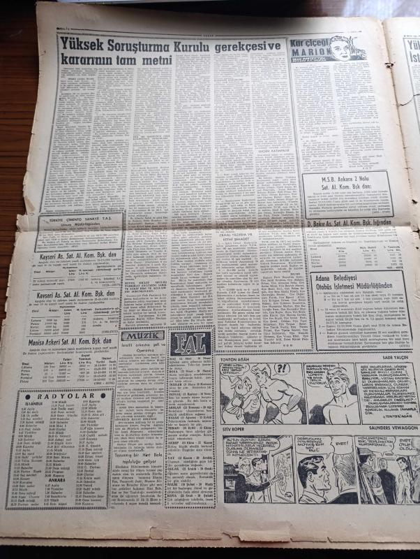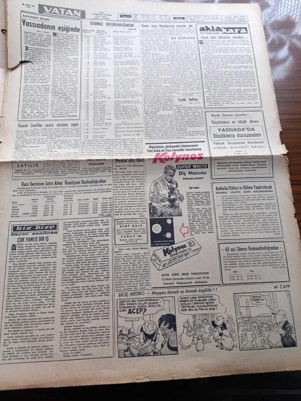 Vatan Gazetesi - 11 Ekim 1960 - Halkı Silahlandıran Sanıklara Ait Kararname Yüksek Adalet Divanına Verildi - Celal Bayar Suçu Adnan Menderes'in Üzerine Attı - Yassıada'nın Eşiğinde Yazan Ahmet Emin Yalman - Adnan Menderes Silahlanma Konusunda Bu Halkı Seçime Hazırlamak İçin Alınmış Bir Tedbirdi Dedi - Ethem Menderes İfade Verdikten Sonra Fotoğraf - Celal Bayar'ın Eşi Cuma Günü Yassıada'ya Gidecek - Yeşilköy Havaalanında Turistik Lokantada 10 Kişi Zehirlendi - Ticaret Liseliler Dün Sessiz Yürüyüş Yaptılar - 6 7 Eylül Olayları Yazan Orhan Birgit Yazı Dizisi - Taş Devri Çizen Mıstık - Seller Arka Girsin Artık Yazan Behçet Kemal Çağlar Köşe Yazısı - Emil Galip Sandalcı Köşe Yazısı - Hoş Memo Karikatür Çizen Al Capp - Tonton Agah Çizen Sade Yalçın - Stiv Roper Çizen Saunders Ve Waggon - Kır Çiçeği Marion Yazan Jean Martet Yazı Dizisi - Fenerbahçe İzmir Deplasmanına Gidecek - Basketbol Birinci Ligi Galatasaray Darüşşafaka Maçı İle Başlıyor - Asrın Davası Başlarken - Şemi Ergin Mektubu adlı eser, Kitap > Süreli Yayınlar > Gazeteler > Türkiye > Genel > Günlük kategorisinde İkinci El olarak satıştadır.