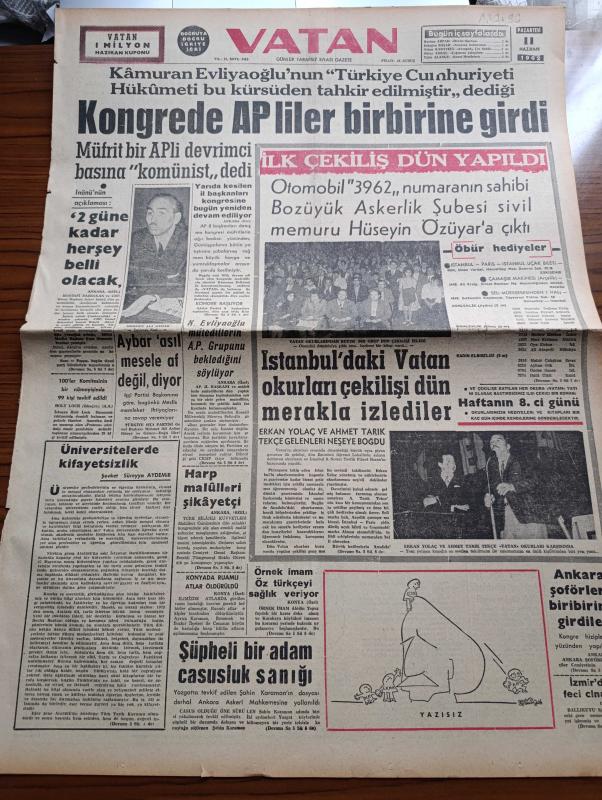 Vatan Gazetesi - 11 Haziran 1962 - Şevket Süreyya Aydemir Köşe Yazısı - Vatan Gazetesi İlk Çekilişi Yapıldı - Otomobil 3962 Numaranın Sahibini Hüseyin Özüyar'a Çıktı - Kongrede Adalet Partililer Birbirine Girdi - Türkiye İşçi Partisi Lideri Mehmet Ali Aybar Asıl Mesele Af Değil Diyor - Kamuran Evliyaoğlu - İsmet İnönü'nüm Hükümet Açıklaması - Örnek İmam Abidin Topuz - Şüpheli Adam Şahin Karaman Casusluk Sanığı - Kızılay Şişli Dispanseri Açılıyor - Devlet Operası Üzerine - Rüzgar Çelebi Çizen Guy Bara - Galata Köprüsünde Tamirat - Bakırköy Akıl Hastanesi'nde Tedavi Edilen Deliler Spor Gösterisi Yaptı - Güney Kore'de Amerikan Askerleri Kışlalardan Çıkarılmayacak - Diktatör Franco Baskıyı Arttırdı - Oyuncu Kız Çizgi Roman - Üç Perdelik Cinayet Yazan Agatha Christie Yazı Dizisi - Afrika Güneşinde Bir Beyaz Kadın Marina Vlady - Noyan Amca Dert Ortağı - Şampiyon Galatasaray Göztepeye Mağlup - Altınordu 3 Karşıyaka 3 - Dünya Kupasının Favorileri Yenildi - Amatörde Karagücü Şampiyon, Ahmet Emin Yalman tarafından kaleme alınmıştır. Vatan Gazetesi - 11 Haziran 1962 - Şevket Süreyya Aydemir Köşe Yazısı - Vatan Gazetesi İlk Çekilişi Yapıldı - Otomobil 3962 Numaranın Sahibini Hüseyin Özüyar'a Çıktı - Kongrede Adalet Partililer Birbirine Girdi - Türkiye İşçi Partisi Lideri Mehmet Ali Aybar Asıl Mesele Af Değil Diyor - Kamuran Evliyaoğlu - İsmet İnönü'nüm Hükümet Açıklaması - Örnek İmam Abidin Topuz - Şüpheli Adam Şahin Karaman Casusluk Sanığı - Kızılay Şişli Dispanseri Açılıyor - Devlet Operası Üzerine - Rüzgar Çelebi Çizen Guy Bara - Galata Köprüsünde Tamirat - Bakırköy Akıl Hastanesi'nde Tedavi Edilen Deliler Spor Gösterisi Yaptı - Güney Kore'de Amerikan Askerleri Kışlalardan Çıkarılmayacak - Diktatör Franco Baskıyı Arttırdı - Oyuncu Kız Çizgi Roman - Üç Perdelik Cinayet Yazan Agatha Christie Yazı Dizisi - Afrika Güneşinde Bir Beyaz Kadın Marina Vlady - Noyan Amca Dert Ortağı - Şampiyon Galatasaray Göztepeye Mağlup - Altınordu 3 Karşıyaka 3 - Dünya Kupasının Favorileri Yenildi - Amatörde Karagücü Şampiyon adlı eser Türkçe dilindedir.