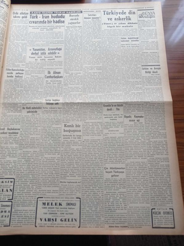 Vatan Gazetesi - 13 Eylül 1949 - İmar Bankasından İstediğiniz Kredi - Dışişleri Bakanı Necmettin Sadak Dün Geldi - Sakallı Vatan Haini Aslan Humbaracı Tekrar Sahnede - Filibe Konsolosluğumuzda Patlayan Bomba Hadisesi - Raman Petrolü Borularla İskenderun'a Sevkedilecek - İsrail Başbakanı Ben Gurion'a Suikast Teşebbüsü - Demokrat Parti Başkanı Celal Bayar - Roosevelt'in En Güzel Eseri - Hüsrev Gerede - Berlin Oteli Yazan Vicki Baum Yazı Dizisi - İlk Alman Cumhurbaşkanı Hür Demokratlardan Theodor Heuss Seçildi - Kremlin'in En Büyük Derdi Tito - Ankara Radyosundan Kurtulup İstanbul Radyosuna Kavuşanlar - Atina Hadiseleri Ve Burhan Felek - Sylvania Floresan - Ali Muhiddin Hacı Bekir - Arı Pirinç Unu - Hasan Kolonyası Losyonları Parfümleri - Tungsram Ampulleri, Ahmet Emin Yalman tarafından kaleme alınmıştır. Vatan Gazetesi - 13 Eylül 1949 - İmar Bankasından İstediğiniz Kredi - Dışişleri Bakanı Necmettin Sadak Dün Geldi - Sakallı Vatan Haini Aslan Humbaracı Tekrar Sahnede - Filibe Konsolosluğumuzda Patlayan Bomba Hadisesi - Raman Petrolü Borularla İskenderun'a Sevkedilecek - İsrail Başbakanı Ben Gurion'a Suikast Teşebbüsü - Demokrat Parti Başkanı Celal Bayar - Roosevelt'in En Güzel Eseri - Hüsrev Gerede - Berlin Oteli Yazan Vicki Baum Yazı Dizisi - İlk Alman Cumhurbaşkanı Hür Demokratlardan Theodor Heuss Seçildi - Kremlin'in En Büyük Derdi Tito - Ankara Radyosundan Kurtulup İstanbul Radyosuna Kavuşanlar - Atina Hadiseleri Ve Burhan Felek - Sylvania Floresan - Ali Muhiddin Hacı Bekir - Arı Pirinç Unu - Hasan Kolonyası Losyonları Parfümleri - Tungsram Ampulleri adlı eser Türkçe dilindedir.