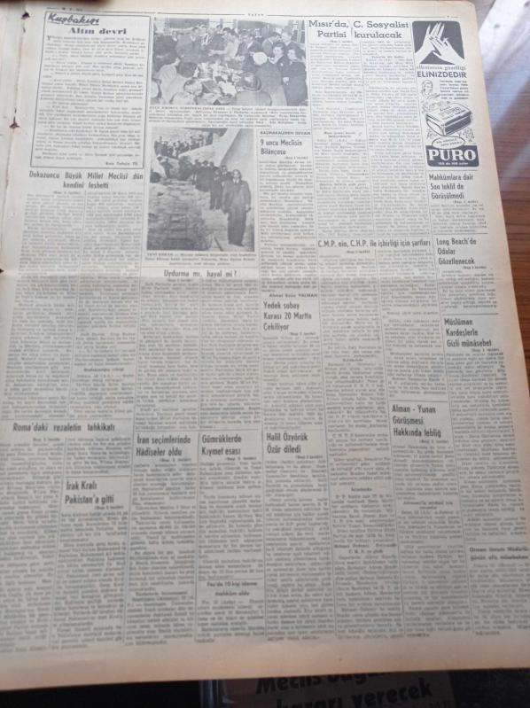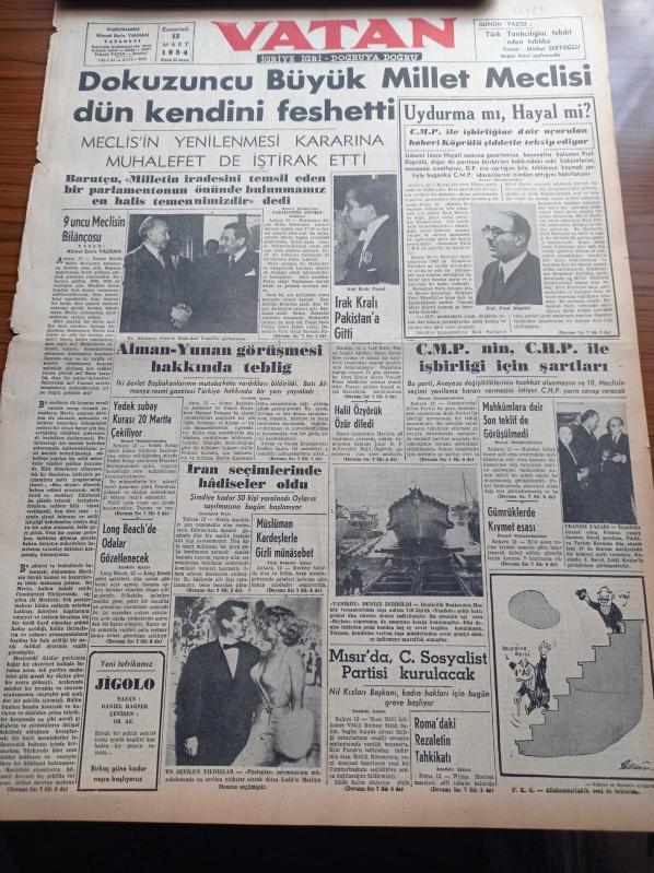 Vatan Gazetesi - 13 Mart 1954 - Dokuzuncu Büyük Millet Meclisi Dün Kendini Feshetti - Profesör Fuad Köprülü - Irak Kralı Faysal Pakistan'a Gitti - Müslüman Kardeşlerle Gizli Münasebet - En Sevilen Yıldızlar Allan Ladd'le Marilyn Monroe Seçildi - Cumhuriyetçi Millet Partisinin CHP İle İşbirliği İçin Şartları - 16 Mart Şehitlerini Anma Töreni - İbrahim Müteferrika'yı Anma Töreni Yapılacak - Tanzim Satışları Şirketi Kuruluyor - Milli Türk Talebe Birliğinin Amerika Gençliğine Mesajı - Otomobil Fabrikaları Rekabete Başladı - Eva Peron'un Benzeri Bir Fransız Yıldızı Andree Debar - Türkiye İspanya Milli Maçı Yarın Yapılıyor - Arsenal'in Rusya Seyahati - Good Year - Cutex Tırnak Cilası - Jawa Motosikletleri adlı eser, Kitap > Süreli Yayınlar > Gazeteler > Türkiye > Genel > Günlük kategorisinde İkinci El olarak satıştadır.