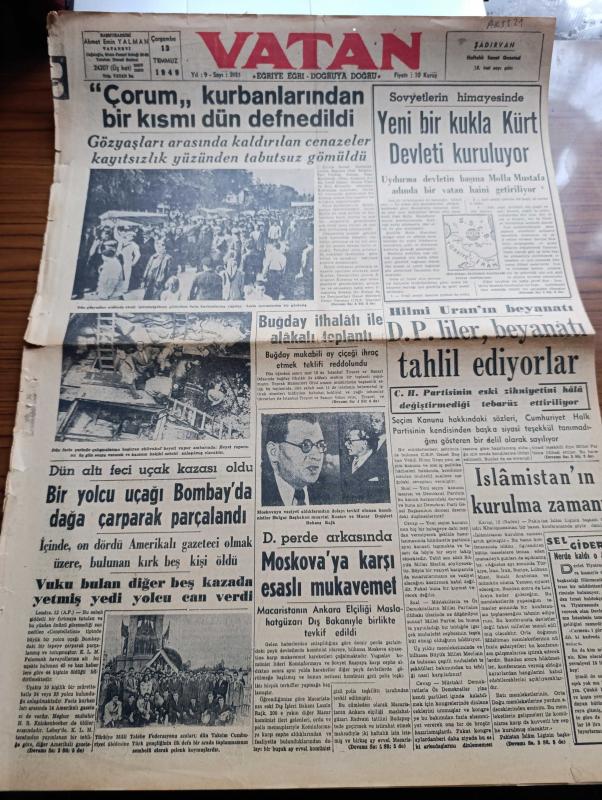 Vatan Gazetesi - 13 Temmuz 1949 - Çorum Kurbanlarının Bir Kısmı Defnedildi - Sovyetlerin Himayesinde Yeni Bir Kukla Kürt Devleti Kuruluyor - Hilmi Uran'ın Beyanatı - Demokrat Parti'liler Hilmi Uran'ın Beyanatını Tahlil Ediyor - İslamistan'ın Kurulma Zamanı - Demirperde Arkasında Moskova'ya Karşı Esaslı Mukavemet - Dün Altı Feci Uçak Kazası Oldu - Berlin Oteli Yazan Vicki Baum Yazı Dizisi - Geçmişte Bugün Sadrazam Ayas Paşa'nın Ölümü Yazan Feridun Fazıl Tülbentçi Yazı Dizisi - Doktor Lütfi Kırdar Dün Talebe Federasyonu Mümessilleri İle Görüştü - Köylüye Toprak - Cumhurbaşkanı İsmet İnönü'nün Erzurumlulara Hitabesi - Prenses Faize İstanbul'a Geliyor - Kahve Fiyatları Neden Yükseliyor - Yurt Köşelerinden Röportajlar Yazan Recep Bilginer - Hindistan'da Komünizm Nasıl Ezildi - Çapamarka - Bulmaca - Devlet Operasında Carmen Ve Sevil Berberi adlı eser, Kitap > Süreli Yayınlar > Gazeteler > Türkiye > Genel > Günlük kategorisinde İkinci El olarak satıştadır.