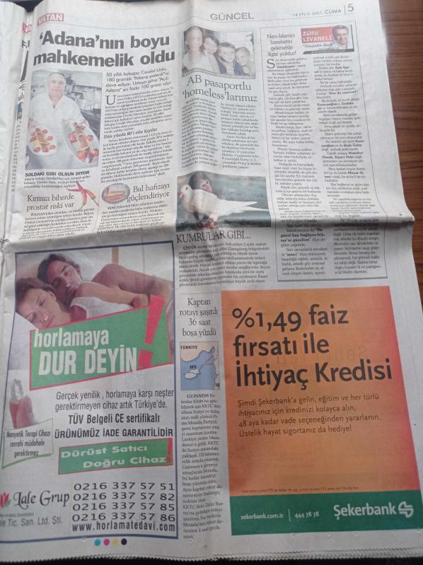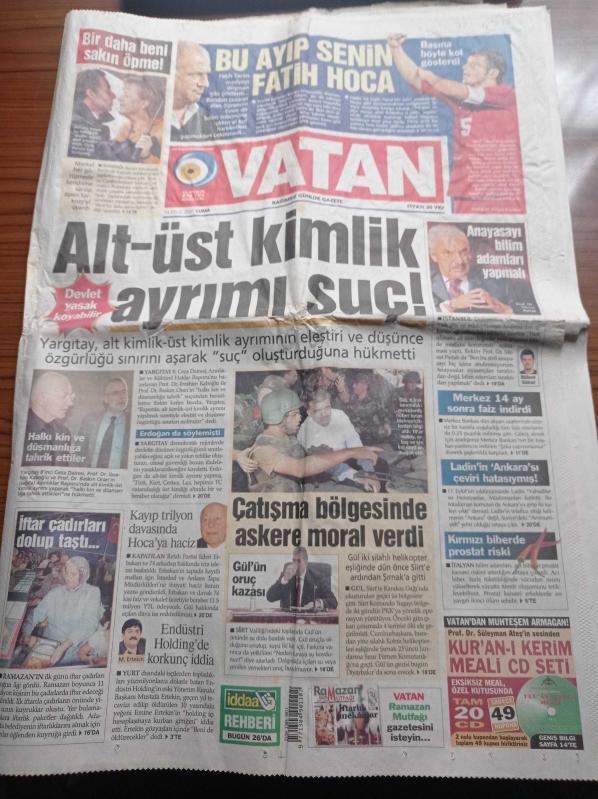 Vatan Gazetesi - 14 Eylül 2007 - Portekiz Hocası Scolari'den Mike Tyson Yumruğu - Emre Belözoğlu Basına Böyle Kol Gösterdi - Bu Ayıp Senin Fatih Terim - Hülya Avşar Önce Türban Sonra Haç Taktı - Abdullah Gül'ün Oruç Kazası - Almanya Başbakanı Angela Merkel Fransa Cumhurbaşkanı Sarkozy'yi Bir Daha Beni Öpme Diye Uyardı -Alt Üst Kimliği Suç - İftar Çadırları Doldu Taştı - Baskın Oran - Kayıp Trilyon Davasında Necmettin Erbakan'a Haciz adlı eser Türkçe dilindedir.