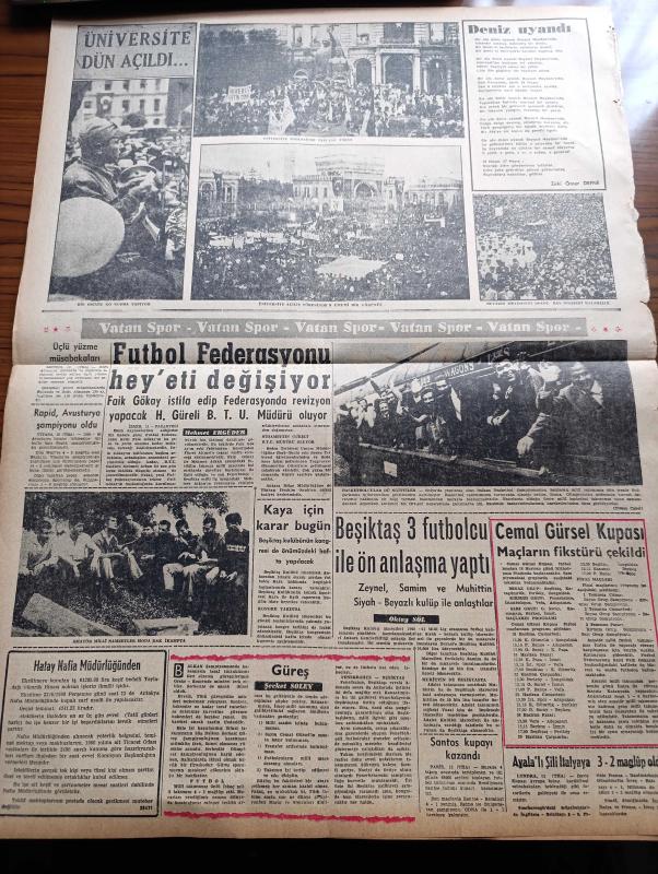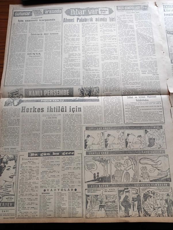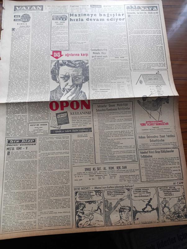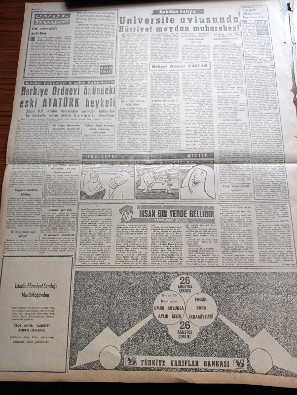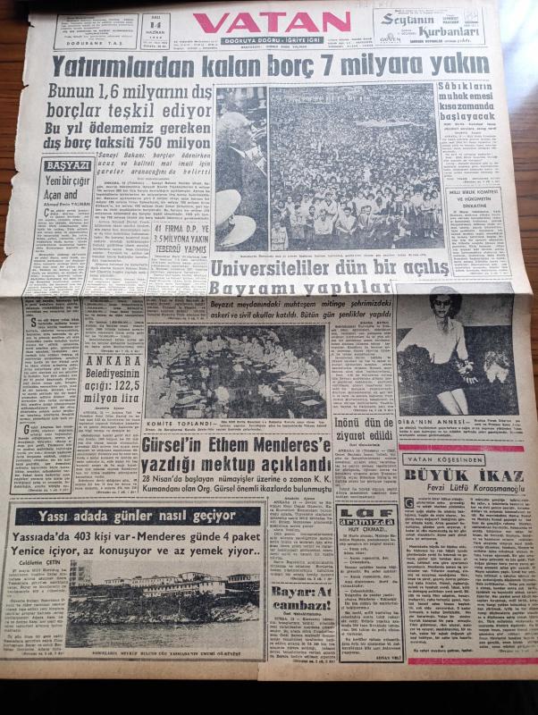 Vatan Gazetesi - 14 Haziran 1960 - Ahmed Emin Yalman Köşe Yazısı - Yatırımlardan Kalan Borç 7 Milyara Yakın - 41 Firma Demokrat Parti'ye 3,5 Milyona Yakın Teberrü Yapmış - Ankara Belediyesi'nin Açığı 122,5 Milyon Lira - Yassıadada Günler Nasıl Geçiyor Yazan Celalettin Çetin - Fevzi Lütfü Karaosmanoğlu Köşe Yazısı - Sabıkların Muhakemesi Kısa Zamanda Başlayacak - Cemal Gürsel'in Ethem Menderes'e Yazdığı Mektup Açıklandı - İnsan Bir Yerde Bellidir Yazan Mehmet Seyda Yazı Dizisi - Harbiye Orduevi Önündeki Eski Atatürk Heykeli - Üniversite Avlusunda Hürriyet Meydan Muharebesi - Özcan Ergüder - Akla Kara Yazan Emil Galip Sandalcı - Hazineye Bağışlar Hızla Devam ediyor - Kanlı Perşembe Yazan Sadun Tanju - Gece Gondolları Yazan Albert Jean Yazı Dizisi - Lüp Lüp Amca Çizgi Roman Ric - Tonton Agah Çizgi Roman Sade Yalçın - Üniversite Dün Açıldı - Futbol Federasyonu Heyeti Değişiyor - Zeki Ömer Defne Şiir Deniz Uyandı - Beşiktaş 3 Futbolcu İle Ön Anlaşma Yaptı - Cemal Gürsel Kupası Maçları adlı eser, Kitap > Süreli Yayınlar > Gazeteler > Türkiye > Genel > Günlük kategorisinde İkinci El olarak satıştadır.