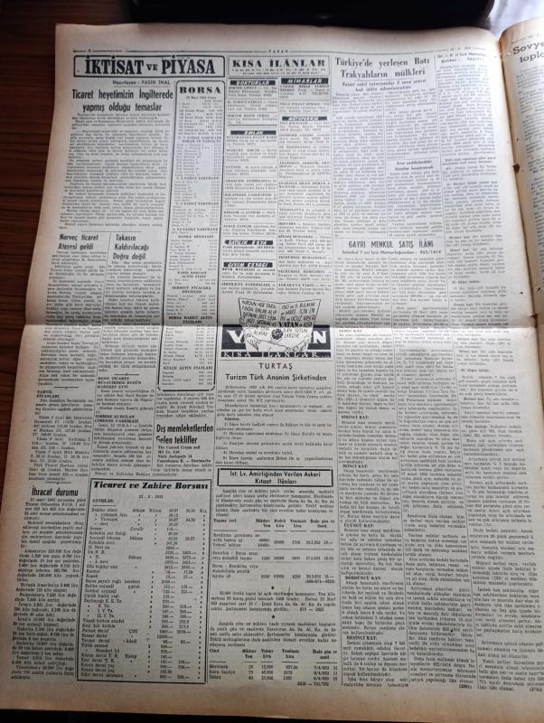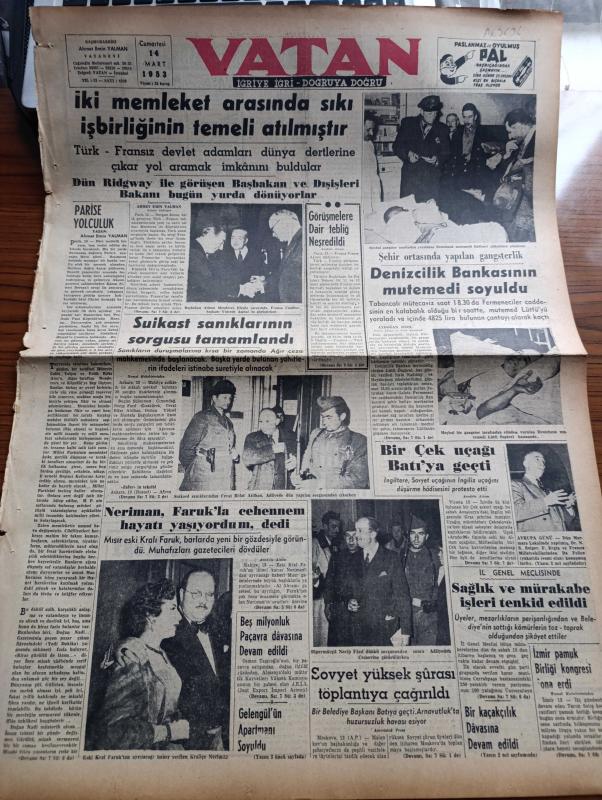 Vatan Gazetesi - 14 Mart 1953 - Paris'e Yolculuk Yazan Ahmet Emin Yalman Köşe Yazısı - Türk Fransız Devletleri Arasında Sıkı İşbirliğinin Temeli Atılmıştır - Başbakan Adnan Menderes Elysee Sarayında Fransa Cumhurbaşkanı Vincent Auriol İle Görüşürken - Neriman Eski Mısır Kralı Faruk'la Cehennem Hayatı Yaşıyordum Dedi - Şehir Ortasında Yapılan Gangsterlik Denizcilik Bankasının Mutemedi Soyuldu - Bir Çek Uçağı Batıya Geçti - İzmir Pamuk Kongresi Sona Erdi - 14 Mart Neden Tıbbiyeliler Bayramıdır - Kadınlar Tekkesi Yazan Refik Halid Karay Yazı Dizisi - Türk Devrim Ocakları Avrupa Günü Yapıldı - Onbir Mau Mau İdam Edildi - Uzakdoğu'dan Hakikatler Ve Masallar Yazan Altemur Kılıç Yazı Dizisi - Meksika Yazan Leyla Kara Yazı Dizisi - Dinlediklerimiz Celal İnce - Radyo Amatörlüğü - Türkiye'de Yerleşen Batı Trakyalıların Mülkleri - Krem Pertev - Velox Süt Makineleri - Gripin - Necipbey Kremleri - İstanbul Ankara İzmir Radyosu Programı - Derman Ağrı Kesici adlı eser, Kitap > Süreli Yayınlar > Gazeteler > Türkiye > Genel > Günlük kategorisinde İkinci El olarak satıştadır.