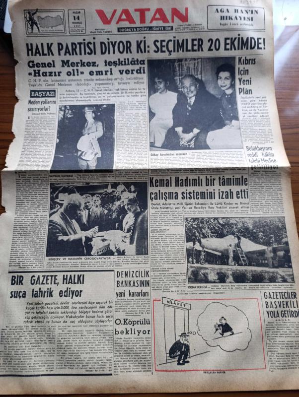 Vatan Gazetesi - 14 Temmuz 1957 - Ahmet Emin Yalman Köşe Yazısı - Halk Partisi Diyor ki Seçimler 20 Ekim'de - Kemal Hadımlı Bir Tamimle Çalışma Sistemini İzah Etti - Kıbrıs İçin Yeni Plan - Gazeteciler Başvekil Adnan Menderes'i Getirdi - Geçmiş Zaman Fıkraları Sultan Hamit Zamanı Yazan Abdülhak Şinasi Hisar - Rauf Bey'le Münakaşalar General Ali Fuat Cebesoy Yazıyor Yazı Dizisi - Eflatun Kız Yazan Nihal Yeğinobalı Yazı Dizisi - Adnan Veli'den Fantezi - Pakistan Amerika Müşterek Tebliği - Asya Gribi Türkiye'yi Sardı - 1001 Gece Masalları Hazırlayan Suat Taşer Yazı Dizisi - Fenerbahçe Kulübünün Fevkalade Kongresi Bugün Yapılıyor - İstanbul Yarışları Sürprizle Başladı - Hakkı Yeten Federasyona Döndü - Hoş Memo Karikatür, Ahmet Emin Yalman tarafından kaleme alınmıştır. Vatan Gazetesi - 14 Temmuz 1957 - Ahmet Emin Yalman Köşe Yazısı - Halk Partisi Diyor ki Seçimler 20 Ekim'de - Kemal Hadımlı Bir Tamimle Çalışma Sistemini İzah Etti - Kıbrıs İçin Yeni Plan - Gazeteciler Başvekil Adnan Menderes'i Getirdi - Geçmiş Zaman Fıkraları Sultan Hamit Zamanı Yazan Abdülhak Şinasi Hisar - Rauf Bey'le Münakaşalar General Ali Fuat Cebesoy Yazıyor Yazı Dizisi - Eflatun Kız Yazan Nihal Yeğinobalı Yazı Dizisi - Adnan Veli'den Fantezi - Pakistan Amerika Müşterek Tebliği - Asya Gribi Türkiye'yi Sardı - 1001 Gece Masalları Hazırlayan Suat Taşer Yazı Dizisi - Fenerbahçe Kulübünün Fevkalade Kongresi Bugün Yapılıyor - İstanbul Yarışları Sürprizle Başladı - Hakkı Yeten Federasyona Döndü - Hoş Memo Karikatür adlı eser Türkçe dilindedir.