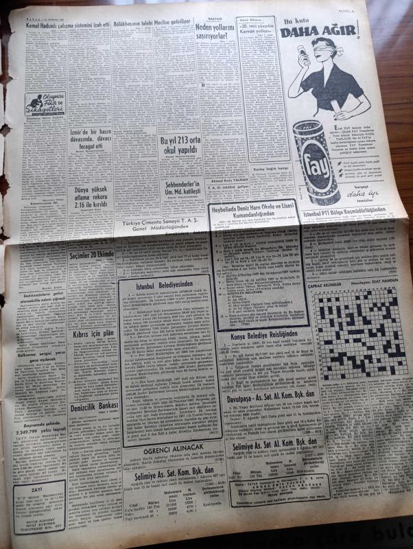Vatan Gazetesi - 14 Temmuz 1957 - Ahmet Emin Yalman Köşe Yazısı - Halk Partisi Diyor ki Seçimler 20 Ekim'de - Kemal Hadımlı Bir Tamimle Çalışma Sistemini İzah Etti - Kıbrıs İçin Yeni Plan - Gazeteciler Başvekil Adnan Menderes'i Getirdi - Geçmiş Zaman Fıkraları Sultan Hamit Zamanı Yazan Abdülhak Şinasi Hisar - Rauf Bey'le Münakaşalar General Ali Fuat Cebesoy Yazıyor Yazı Dizisi - Eflatun Kız Yazan Nihal Yeğinobalı Yazı Dizisi - Adnan Veli'den Fantezi - Pakistan Amerika Müşterek Tebliği - Asya Gribi Türkiye'yi Sardı - 1001 Gece Masalları Hazırlayan Suat Taşer Yazı Dizisi - Fenerbahçe Kulübünün Fevkalade Kongresi Bugün Yapılıyor - İstanbul Yarışları Sürprizle Başladı - Hakkı Yeten Federasyona Döndü - Hoş Memo Karikatür adlı eser, Kitap > Süreli Yayınlar > Gazeteler > Türkiye > Genel > Günlük kategorisinde İkinci El olarak satıştadır.