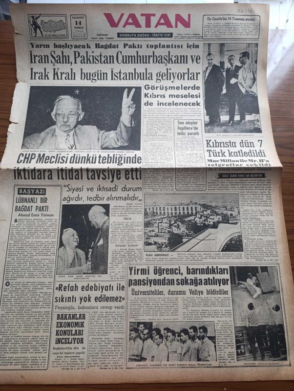 Vatan Gazetesi - 14 Temmuz 1958 - Lübnanlı Bir Bağdat Paktı Yazan Ahmet Emin Yalman Köşe Yazısı - İran Şahı Pakistan Cumhurbaşkanı Ve Irak Kralı Bugün İstanbul'a Geliyorlar - CHP Meclisi Dünkü Tebliğinde İktidara İtidal Tavsiye Etti - İsmet İnönü Faik Ahmet Barutçu ile Tokalaşıyor Fotoğraf - Kıbrıs'ta Dün 7 Türk Katledildi - Sivas Milletvekili Turhan Feyzioğlu Refah Edebiyatı İle Sıkıntı Yok Edilemez Dedi - Yirmi Öğrenci Barındıkları Pansiyondan Sokağa Atılıyor - Yandan Akıyor Yandan Adnan Veli'nin Yeni Romanı Yazı Dizisi - Taş Devri Çizen Mıstık - Çakaralmaz Hafiye Çizen Eflatun Nuri - Çekoslovakyadaki Film Festivaline Bu Yıl Katılıyoruz - Batık Dumlupınar Denizaltısı Ekim Ayına Kadar Çıkarılacak - Oktay Akbal Köşe Yazısı - Güzel Model Sylima'nın Şansı Açıldı - Kalbimin Sahibi Yazan Nihal Yeğinobalı Yazı Dizisi - Şu Ölüm Denilen Şey Yazan Frederic Dard Yazı Dizisi - İstanbul Ankara Radyosu Programı - Ankara Atletleri İstanbulu Mağlup Ettiler 127 114 - Nişantaşı Kulübü Kongresi, Ahmet Emin Yalman tarafından kaleme alınmıştır. Vatan Gazetesi - 14 Temmuz 1958 - Lübnanlı Bir Bağdat Paktı Yazan Ahmet Emin Yalman Köşe Yazısı - İran Şahı Pakistan Cumhurbaşkanı Ve Irak Kralı Bugün İstanbul'a Geliyorlar - CHP Meclisi Dünkü Tebliğinde İktidara İtidal Tavsiye Etti - İsmet İnönü Faik Ahmet Barutçu ile Tokalaşıyor Fotoğraf - Kıbrıs'ta Dün 7 Türk Katledildi - Sivas Milletvekili Turhan Feyzioğlu Refah Edebiyatı İle Sıkıntı Yok Edilemez Dedi - Yirmi Öğrenci Barındıkları Pansiyondan Sokağa Atılıyor - Yandan Akıyor Yandan Adnan Veli'nin Yeni Romanı Yazı Dizisi - Taş Devri Çizen Mıstık - Çakaralmaz Hafiye Çizen Eflatun Nuri - Çekoslovakyadaki Film Festivaline Bu Yıl Katılıyoruz - Batık Dumlupınar Denizaltısı Ekim Ayına Kadar Çıkarılacak - Oktay Akbal Köşe Yazısı - Güzel Model Sylima'nın Şansı Açıldı - Kalbimin Sahibi Yazan Nihal Yeğinobalı Yazı Dizisi - Şu Ölüm Denilen Şey Yazan Frederic Dard Yazı Dizisi - İstanbul Ankara Radyosu Programı - Ankara Atletleri İstanbulu Mağlup Ettiler 127 114 - Nişantaşı Kulübü Kongresi adlı eser Türkçe dilindedir.