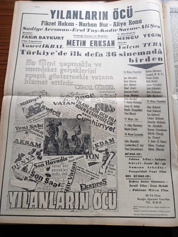 Vatan Gazetesi - 15 Nisan 1962 - Yılanların Öcü Filmi Tam Sayfa İlanı - Şevket Süreyya Aydemir Köşe Yazısı - Subaylara Af Tasarısı Bugün Hafta Mecliste - Genelkurmay Başkanı Cevdet Sunay Ve Kuvvet Kumandanları Kütahyaya Gitti - Devlet Bakanı Nihat Su Tek Başına Siyasi Af Huzur Getirmez Dedi - 147'ler İşi Kapanırken Yazan Haldun Taner - Filmciler Sansüre Cephe Aldı - Elektriğe De Zam Yapılacak - Çağlayanlı Vadi Yazan Mustafa Necati Sepetçioğlu Yazı Dizisi - 1747'den Günümüze Kadar Ordu Ve Politika Yazan Nizamettin Nazif Tepedenlioğlu Yazı Dizisi - Oscar'ı Kazanması Onu Yeni Bir İnsan Yaptı Sophia Loren - Kuzeyli İlahe Anita Ekberg - Chapman Raporu Yazan İrving Wallas Yazı Dizisi - Alain Resnais'in Dünyası - Meşrutiyet Kıraathanesi Yazan Rıfat Ilgaz - Fikret Hakan - Kadir Savun - Ali Şen - Fakir Baykurt - Müzik Yalçın Tura - Aliye Rona - Fenerbahçe Karşıyaka'yı Eze Eze Yendi - İstanbulspor Altay'ı Açık Farkla Mağlup Etti - Spor Toto'da 34. Hafta Hasılatı - PTT Takımı Feriköy'ü Yendi, Ahmet Emin Yalman tarafından kaleme alınmıştır. Vatan Gazetesi - 15 Nisan 1962 - Yılanların Öcü Filmi Tam Sayfa İlanı - Şevket Süreyya Aydemir Köşe Yazısı - Subaylara Af Tasarısı Bugün Hafta Mecliste - Genelkurmay Başkanı Cevdet Sunay Ve Kuvvet Kumandanları Kütahyaya Gitti - Devlet Bakanı Nihat Su Tek Başına Siyasi Af Huzur Getirmez Dedi - 147'ler İşi Kapanırken Yazan Haldun Taner - Filmciler Sansüre Cephe Aldı - Elektriğe De Zam Yapılacak - Çağlayanlı Vadi Yazan Mustafa Necati Sepetçioğlu Yazı Dizisi - 1747'den Günümüze Kadar Ordu Ve Politika Yazan Nizamettin Nazif Tepedenlioğlu Yazı Dizisi - Oscar'ı Kazanması Onu Yeni Bir İnsan Yaptı Sophia Loren - Kuzeyli İlahe Anita Ekberg - Chapman Raporu Yazan İrving Wallas Yazı Dizisi - Alain Resnais'in Dünyası - Meşrutiyet Kıraathanesi Yazan Rıfat Ilgaz - Fikret Hakan - Kadir Savun - Ali Şen - Fakir Baykurt - Müzik Yalçın Tura - Aliye Rona - Fenerbahçe Karşıyaka'yı Eze Eze Yendi - İstanbulspor Altay'ı Açık Farkla Mağlup Etti - Spor Toto'da 34. Hafta Hasılatı - PTT Takımı Feriköy'ü Yendi adlı eser Türkçe dilindedir.