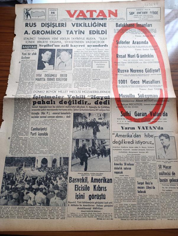 Vatan Gazetesi - 16 Şubat 1957 - Ahmet Emin Yalman Köşe Yazısı - Rus Dışişleri Vekilliğine A. Gromiko Tayin Edildi - İşletmeler Vekili Samed Ağaoğlu Hayat Pahalı Değildir Dedi - Cumhuriyetçi Parti Kuruldu - 1934 Doğumlu Erler Mart'ta Terhis Ediliyor - Profesör Erick Frank'ın Cenazesi Rumelihisarında Türk Kabristanına Gömüldü - 58 Macar Mültecisi De Bugün Gelecek - Turgut Reis'in Mezarı Libya'da Kalacak - Amerika 50 Milyon Dolarlık Yatırım Yapacak - Eski Ahbap Reşat Nuri Güntekin'in İlk Eseri Yazı Dizisi - Yeni Türk Ticaret Kanunu Yazan Doktor Nihat Türel - 1956 Yılında Türkiye'de 1510 Gazete Ve Dergi Yayınlandı - Bursa'da Rock And Roll Festivali Tertiplendi - Skoda Otobüslerinin %30'nun Bozuk Olduğu İddia Ediliyor - Çanakkale Türk'ün Kahramanlık Destanı Yazan Alan Moorehead Yazı Dizisi - Hoş Memo Karikatür - Haftanın Filmleri Yazan Salah Birsel - ev Kadın Moda - Tek Seçici Eşfak Aykaç Dün Milli Takımı Açıkladı - Galatasaray Modayı Güçlükle Yendi - Amerika Ordu Karması Adana'ya Vardı, Ahmet Emin Yalman tarafından kaleme alınmıştır. Vatan Gazetesi - 16 Şubat 1957 - Ahmet Emin Yalman Köşe Yazısı - Rus Dışişleri Vekilliğine A. Gromiko Tayin Edildi - İşletmeler Vekili Samed Ağaoğlu Hayat Pahalı Değildir Dedi - Cumhuriyetçi Parti Kuruldu - 1934 Doğumlu Erler Mart'ta Terhis Ediliyor - Profesör Erick Frank'ın Cenazesi Rumelihisarında Türk Kabristanına Gömüldü - 58 Macar Mültecisi De Bugün Gelecek - Turgut Reis'in Mezarı Libya'da Kalacak - Amerika 50 Milyon Dolarlık Yatırım Yapacak - Eski Ahbap Reşat Nuri Güntekin'in İlk Eseri Yazı Dizisi - Yeni Türk Ticaret Kanunu Yazan Doktor Nihat Türel - 1956 Yılında Türkiye'de 1510 Gazete Ve Dergi Yayınlandı - Bursa'da Rock And Roll Festivali Tertiplendi - Skoda Otobüslerinin %30'nun Bozuk Olduğu İddia Ediliyor - Çanakkale Türk'ün Kahramanlık Destanı Yazan Alan Moorehead Yazı Dizisi - Hoş Memo Karikatür - Haftanın Filmleri Yazan Salah Birsel - ev Kadın Moda - Tek Seçici Eşfak Aykaç Dün Milli Takımı Açıkladı - Galatasaray Modayı Güçlükle Yendi - Amerika Ordu Karması Adana'ya Vardı adlı eser Türkçe dilindedir.