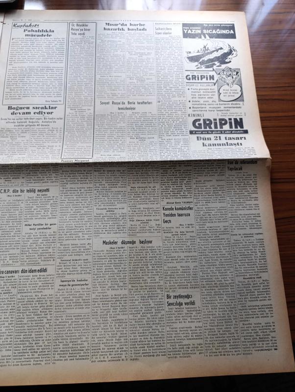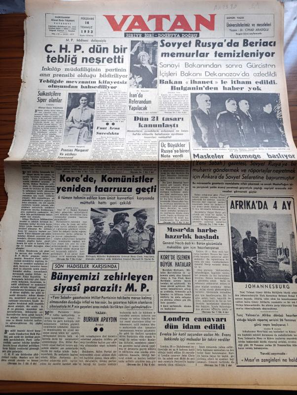 Vatan Gazetesi - 16 Temmuz 1953 - Suikastçilere Siper Olanlar Yazan Ahmet Emin Yalman Köşe Yazısı - Millet Partisi Hadisesi Dolayısıyla CHP Dün Bir Tebliğ Neşretti - İran'da Referandum Yapılacak - Prenses Margaret Fotoğraf - Kore'de Komünistler Yeniden Taarruza Geçti - Sovyet Rusya'da Beriacı Memurlar Temizleniyor - Dün 21 Tasarı Kanunlaştı - Bünyemizi Zehirleyen Siyasi Parazit Millet Partisi Yazan Burhan Apaydın - Londra Canavarı John Christie İdam Edildi - İçimizdeki Şeytan Yazan Raymond Rodiguet Yazı Dizisi - Avrupa Güzellik Müsabakası İstanbul'da Yapılacak - Yunanistan'da Basına Verilen Cezalar Artıyor - Fransa'da Türk Tütünü İle Yapılan Ege Sigarası - İdil Biret İstanbul'da - Varlık Dergisi 20 Yaşında Yazan Oktay Akbal - Yeni Bir Gün Doğacak Yazan Emmanuel Robles Yazı Dizisi - Mavi Gillette Bıçakları - Gripin - Kamyon Fabrikası Kuruluyor - İktisat Ve Piyasa Hazırlayan Fasih İnal - Odeon Mağazaları - Mc Cormick Harman Mağazaları - Bulmaca - Kodak - İstanbul Ankara İzmir Radyosu adlı eser, Kitap > Süreli Yayınlar > Gazeteler > Türkiye > Genel > Günlük kategorisinde İkinci El olarak satıştadır.