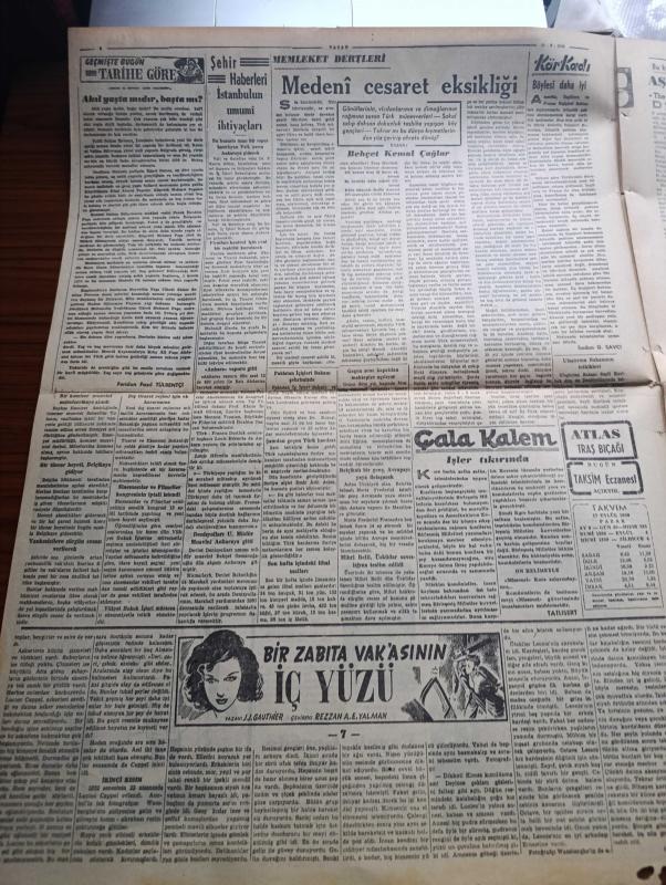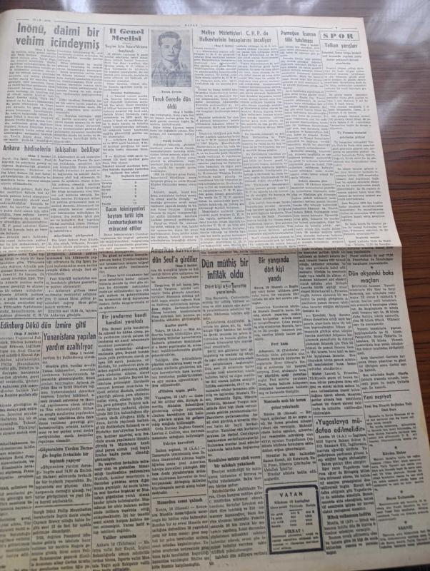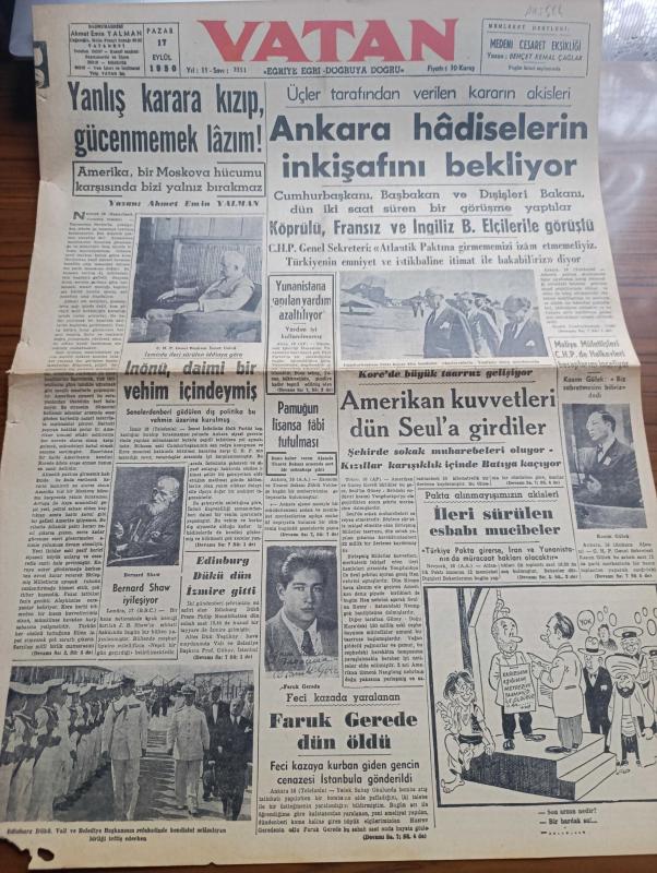 Vatan Gazetesi - 17 Eylül 1950 - Yanlış Karara Kızıp Gücenmemek Lazım Yazan Ahmet Emin Yalman Köşe Yazısı - Fuat Köprülü Fransız Ve İngiliz Büyükelçileriyle Konuştu - Atlantik Paktı - CHP Genel Başkanı İsmet İnönü Daimi Benim İçindeymiş - Bernard Shaw İyileşiyor - Faruk Gerede Dün Öldü - Amerikan Kuvvetleri Dün Seul'a Girdiler - Bir Zabıta Vakasının İçyüzü Yazan J. J. Gauthier Yazı Dizisi - Medeni Cesaret Eksikliği Yazan Behçet Kemal Çağlar - Geçmişte Bugün Yazan Feridun Fazıl Tülbentçi Yazı Dizisi - Bu Kış Göreceğimiz Filmlerden Aşk Melikesi - Sinema Hileleri Yazan Vehbi Belgil - Dünya Karikatürleri - Kanuni Sultan Süleyman Yazan Feridun Fazıl Tülbentçi Yazı Dizisi - Tiyatro Perdeleri Açılırken Yazan Cavit Yamaç - Kore'deki Harp Nasıl İnkişaf Edecek Yazan General Carl Spaatz - Uyuz Ve Deri Hastalıkları İçin Parazitan - İran'da Kürt İsyanının İçyüzü - İstanbul Ankara Radyosu Programı - Bulmaca adlı eser, Kitap > Süreli Yayınlar > Gazeteler > Türkiye > Genel > Günlük kategorisinde İkinci El olarak satıştadır.