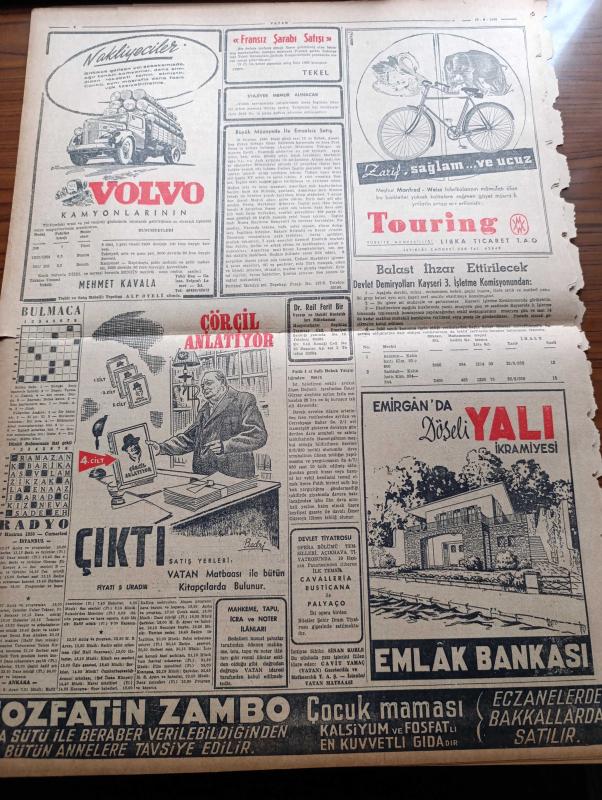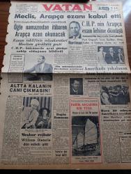 Vatan Gazetesi - 17 Haziran 1950 - Meclis Arapça Ezanı Kabul Etti - Öğle Namazından İtibaren Arapça Ezan Okunacak - CHP'nin Arapça Ezan Lehine Dönüşü - Feyzi Boztepe'nin Devletin Din Üzerindeki Vasilik Sistemine Son Verilmesine Dair Teklifi - Ahmet Emin Yalman Köşe Yazısı - Meşhur Rejisör William Dieterle Dün Sabah Gitti - Amerika'da Yakalanan Atom Bombası Casusları - Bugün Ramazan - İtham Eden Gözler Yazan Henry Bordeaux Yazı Dizisi - Salzburg Musiki Olimpiyatı - Toprak Ofisinin Yağları Çalınmış - Basın Kanunu - Milli Eğitim Bakanı Avni Başman - Resimlerle Hadiseler - Bulgar Viskonsolosu Pop Yordanof Gitti - Amerika'nın Türkiye İran Ve Yunanistan'a Silah Yardımı - Kanuni Sultan Süleyman Yazan Feridun Fazıl Tülbentçi Yazı Dizisi - Volvo Kamyon - Bulmaca - İstanbul Ankara Radyosu Programı - Touring Bisiklet - Fransız Şarabı Satışı adlı eser, Kitap > Süreli Yayınlar > Gazeteler > Türkiye > Genel > Günlük kategorisinde İkinci El olarak satıştadır.