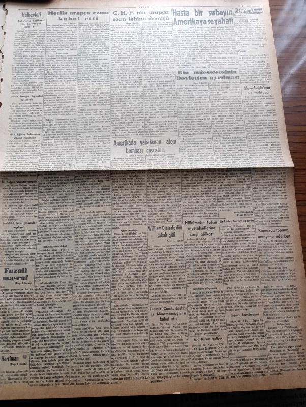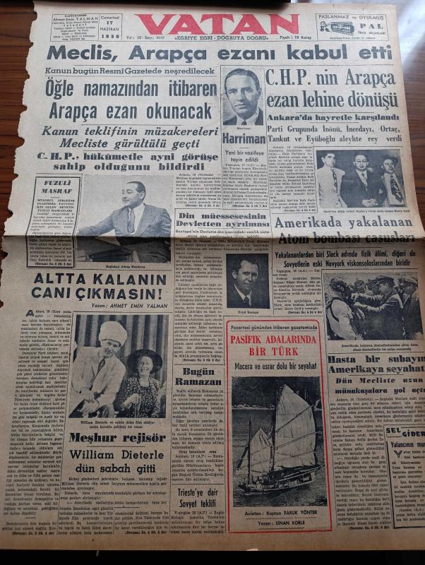 Vatan Gazetesi - 17 Haziran 1950 - Meclis Arapça Ezanı Kabul Etti - Öğle Namazından İtibaren Arapça Ezan Okunacak - CHP'nin Arapça Ezan Lehine Dönüşü - Feyzi Boztepe'nin Devletin Din Üzerindeki Vasilik Sistemine Son Verilmesine Dair Teklifi - Ahmet Emin Yalman Köşe Yazısı - Meşhur Rejisör William Dieterle Dün Sabah Gitti - Amerika'da Yakalanan Atom Bombası Casusları - Bugün Ramazan - İtham Eden Gözler Yazan Henry Bordeaux Yazı Dizisi - Salzburg Musiki Olimpiyatı - Toprak Ofisinin Yağları Çalınmış - Basın Kanunu - Milli Eğitim Bakanı Avni Başman - Resimlerle Hadiseler - Bulgar Viskonsolosu Pop Yordanof Gitti - Amerika'nın Türkiye İran Ve Yunanistan'a Silah Yardımı - Kanuni Sultan Süleyman Yazan Feridun Fazıl Tülbentçi Yazı Dizisi - Volvo Kamyon - Bulmaca - İstanbul Ankara Radyosu Programı - Touring Bisiklet - Fransız Şarabı Satışı, Ahmet Emin Yalman tarafından kaleme alınmıştır. Vatan Gazetesi - 17 Haziran 1950 - Meclis Arapça Ezanı Kabul Etti - Öğle Namazından İtibaren Arapça Ezan Okunacak - CHP'nin Arapça Ezan Lehine Dönüşü - Feyzi Boztepe'nin Devletin Din Üzerindeki Vasilik Sistemine Son Verilmesine Dair Teklifi - Ahmet Emin Yalman Köşe Yazısı - Meşhur Rejisör William Dieterle Dün Sabah Gitti - Amerika'da Yakalanan Atom Bombası Casusları - Bugün Ramazan - İtham Eden Gözler Yazan Henry Bordeaux Yazı Dizisi - Salzburg Musiki Olimpiyatı - Toprak Ofisinin Yağları Çalınmış - Basın Kanunu - Milli Eğitim Bakanı Avni Başman - Resimlerle Hadiseler - Bulgar Viskonsolosu Pop Yordanof Gitti - Amerika'nın Türkiye İran Ve Yunanistan'a Silah Yardımı - Kanuni Sultan Süleyman Yazan Feridun Fazıl Tülbentçi Yazı Dizisi - Volvo Kamyon - Bulmaca - İstanbul Ankara Radyosu Programı - Touring Bisiklet - Fransız Şarabı Satışı adlı eser Türkçe dilindedir.