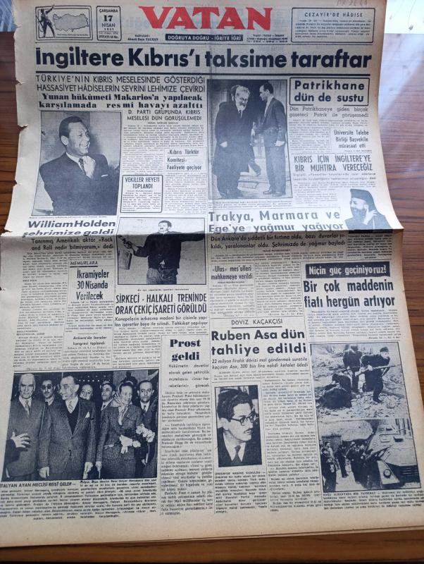 Vatan Gazetesi - 17 Nisan 1957 - Tanınmış Amerikalı Aktör William Holden Rock And Roll Nedir Bilmiyorum Dedi - İngiltere Kıbrıs'ı Taksim'e Taraftar - Sirkeci Halkalı Treninde Orak Çekiç Görüldü - Meşhur İmar Ve Şehircilik Mütehassısı Prost İstanbul'a Geldi - Döviz Kaçakçısı Ruben Asa Dün Tahliye Edildi - Patrikhane Dün De Sustu - Kıbrıs İçin İngiltere'ye Bir Muhtıra Vereceğiz Dedi - Dieppe Newhaven Yolu Yazan Henry Miller Yazı Dizisi - Bir Sanat Geleneği Mahya Yazan Ahmet Kutsi Tecer Köşe Yazısı - Çanakkale Türk'ün Kahramanlık Destanı Yazan Alan Moorehead Yazı Dizisi - Sendikalar Kanunu Tasarısı Hazırlandı - Ramazan Köşesi - Kıbrıs Meselesi Ve Fener Patrikhanesi Yazan Sadun Tanju - Hoş Memo Karikatür - 1001 Gece Masalları Hazırlayan Suat Taşer Yazı Dizisi - Dünya Nelere Gülüyor Karikatür - Batakhane İnsanları Yazan Adnan Veli Yazı Dizisi - Milli Takım Doğu Almanya'yı Da İspanya'yı da Yendi - Mithatpaşa'de Gece Maçları - Adalet Kasımpaşa Bugün Karşılaşıyor - Fenerbahçe Galatasaray Maçı, Ahmet Emin Yalman tarafından kaleme alınmıştır. Vatan Gazetesi - 17 Nisan 1957 - Tanınmış Amerikalı Aktör William Holden Rock And Roll Nedir Bilmiyorum Dedi - İngiltere Kıbrıs'ı Taksim'e Taraftar - Sirkeci Halkalı Treninde Orak Çekiç Görüldü - Meşhur İmar Ve Şehircilik Mütehassısı Prost İstanbul'a Geldi - Döviz Kaçakçısı Ruben Asa Dün Tahliye Edildi - Patrikhane Dün De Sustu - Kıbrıs İçin İngiltere'ye Bir Muhtıra Vereceğiz Dedi - Dieppe Newhaven Yolu Yazan Henry Miller Yazı Dizisi - Bir Sanat Geleneği Mahya Yazan Ahmet Kutsi Tecer Köşe Yazısı - Çanakkale Türk'ün Kahramanlık Destanı Yazan Alan Moorehead Yazı Dizisi - Sendikalar Kanunu Tasarısı Hazırlandı - Ramazan Köşesi - Kıbrıs Meselesi Ve Fener Patrikhanesi Yazan Sadun Tanju - Hoş Memo Karikatür - 1001 Gece Masalları Hazırlayan Suat Taşer Yazı Dizisi - Dünya Nelere Gülüyor Karikatür - Batakhane İnsanları Yazan Adnan Veli Yazı Dizisi - Milli Takım Doğu Almanya'yı Da İspanya'yı da Yendi - Mithatpaşa'de Gece Maçları - Adalet Kasımpaşa Bugün Karşılaşıyor - Fenerbahçe Galatasaray Maçı adlı eser Türkçe dilindedir.