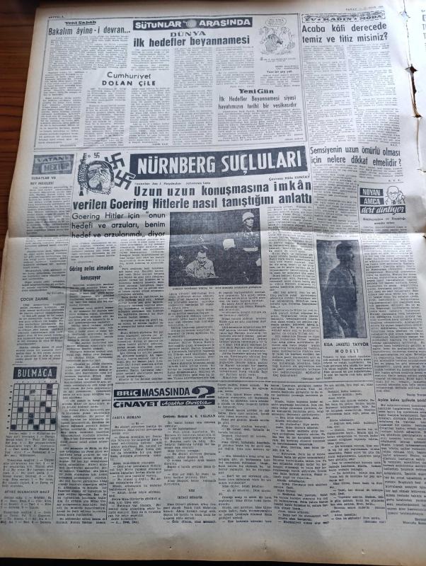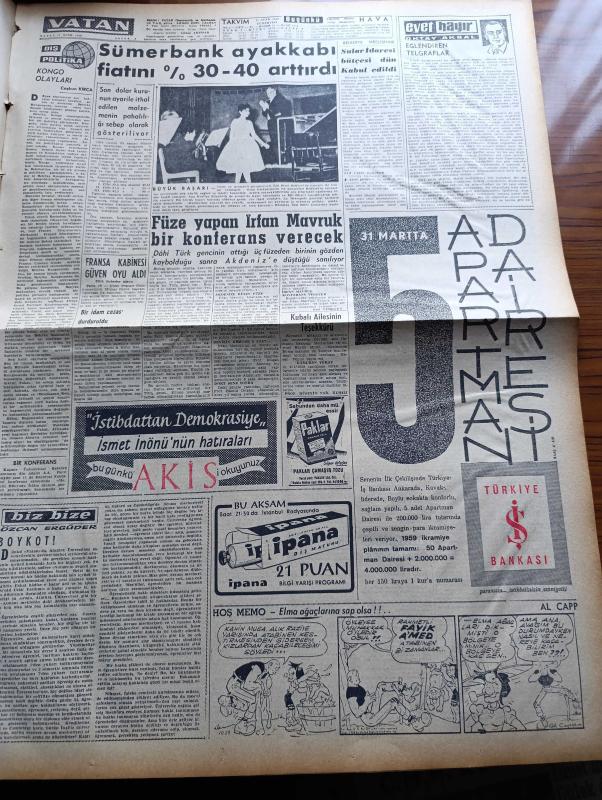 Vatan Gazetesi - 17 Ocak 1959 - Hukuk Devletine Doğru Yazan Ahmet Emin Yalman Köşe Yazısı - Büyük Millet Meclisinin Dün Yaptığı Toplantıda Amerika'ya Yeni Bazı İmtiyaz Tanınması Teklifi Tenkid Edildi - Tamir Edilmek Üzere Haliçe Alınan Köprü Kadıköy İskelesi Camialtı Tersanesi Önünde Batmıştır - Memur Zamları İçin Tasarı 3 Gün İçinde Meclise Geliyor - Eskişehir Emniyet Müdürü Şevket Asbuzoğlu İstifa Etti - CHP Meclisine Hürriyet Partili Yedi Lider Girdi - İmroz'un Makinelerinde Hasar Az Yanık Geminin Sigorta Bedeli 1.600.000 Lira - Ay Tutulduğu Gece Yazan Kemal Bilbaşar Yazı Dizisi - Rusya'nın İki Numaralı Adamı Mikoyan - Salıpazarı Karaköy Rıhtım Tesisleri Takviye Edilecek - Galatasaray Lisesi İdaresi Kızamık Vakasına Dair Açıklama Yaptı - Taş Devri Çizen Mıstık - Sümerbank Ayakkabı Fiyatını %30 40 Arttırdı - Füze Yapan Dahi Türk Genci İrfan Mavruk Bir Konferans Verecek - İstanbul Radyosunda İpana Diş Macunu Bilgi Yarışmasında Programı - Briç Masasında Cinayet Yazan Agatha Christie adlı eser, Kitap > Süreli Yayınlar > Gazeteler > Türkiye > Genel > Günlük kategorisinde İkinci El olarak satıştadır.