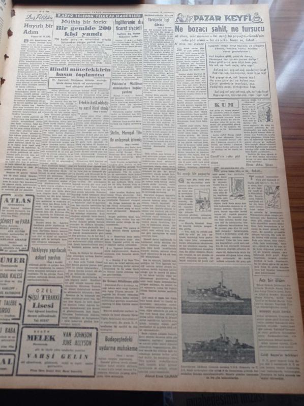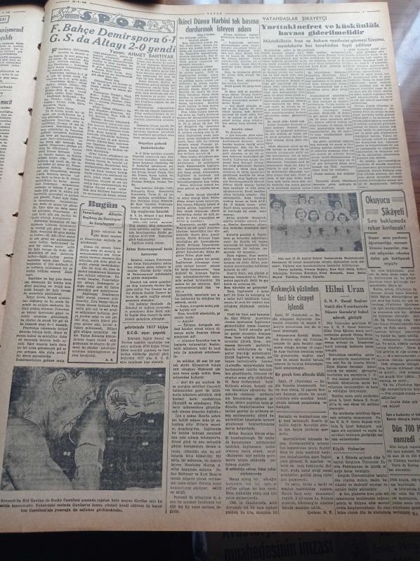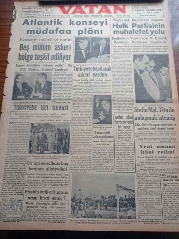 Vatan Gazetesi - 18 Eylül 1949 - Atlantik Konseyi Müdafaa Planı - Başbakan Yardımcısı Nihat Erim'in Anadolu Ajansına Beyanatı - Fenerbahçe Demirspor'u Galatasaray Altay'ı Yendi - Türkiye'de İşçi Davası - Stalin Mareşal Tito İle Anlaşmak İstemiş - İsmet İnönü - Türkiye'ye Yapılacak Askeri Yardım - Berlin Oteli Yazan Vicki Baum Yazı Dizisi - Feridun Fazıl Tülbentçi - Doktor Tarık Zafer Tunaya Tarih Neşriyatı - Atlas Sineması - Özel Şişli Terakki Lisesi - İkinci Dünya Harbini Tek Başına Durdurmak İsteyen Adam - Rudolf Hess - Ecnebi Karikatürleri - Eski Beyoğlu Yazı Dizisi - Nimet Ve Celile Danişmend Resim Sergisi Açıldı - New York'tan Kaliforniya'ya Bedava Seyahat Yazı Dizisi - P&H Ekskavator - Veliefendi'de At Yarışları - Siemens - Good Year - Hacı Nazif Çelebi adlı eser, Kitap > Süreli Yayınlar > Gazeteler > Türkiye > Genel > Günlük kategorisinde İkinci El olarak satıştadır.