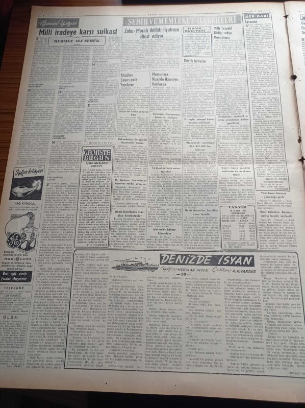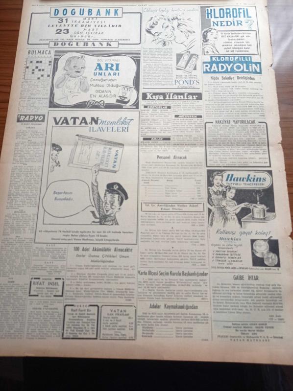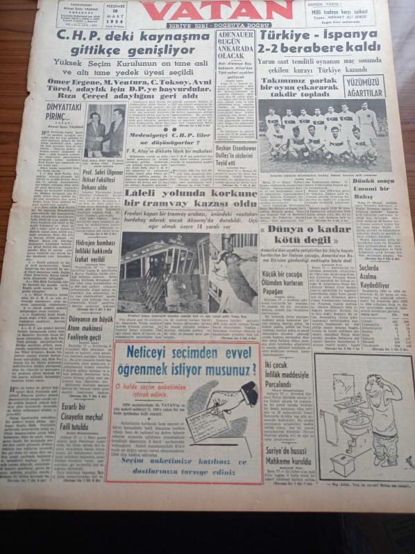 Vatan Gazetesi - 18 Mart 1954 - CHP'deki Kaynaşma Gittikçe Genişliyor - Laleli Yolunda Korkunç Bir Tramvay Kazası Oldu - Profesör Sabri Ülgener İktisat Fakültesi Dekanı Oldu - Dünyanın En Büyük Atom Makinesi Faaliyete Geçti - Başkan Eisenhower Dulles'in Sözlerini Teyid Etti - Türkiye İspanya 2 2 Berabere Kaldı - Falih Rıfkı Atay - Vasfi Rıza Zobu Mahmut Moralı İhtilafı Tiyatroyu Altüst Ediyor - Dünya Bankası - Scala Buz Revüsü - Sümerbank - General Ali Fuat Cebesoy'un Siyasi Hatıraları Yazı Dizisi - İngiliz Faşizmi Tekrar Canlanacak Mı - Jigolo - Lale Oraloğlu Puro Tuvalet Sabunları - Hawkins Tazyikli Tencereleri - Doğubank