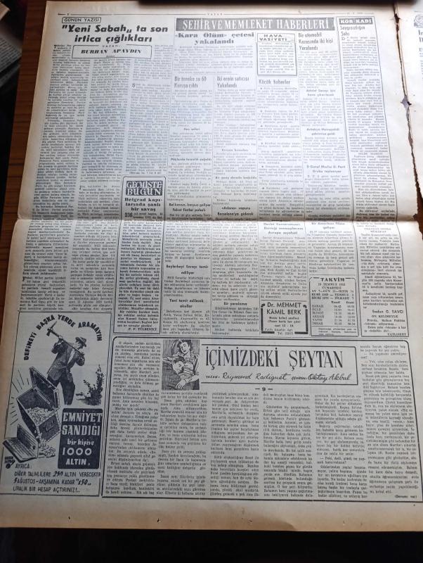 Vatan Gazetesi - 18 Temmuz 1953 - Kurtarıcı Kararlar Yazan Ahmet Emin Yalman Köşe Yazısı - Asliye Ceza Mahkemesi Millet Partisi'nin İtirazını Reddetti - Muhtar Seçimleri Geri Kaldı - Dünya Kraliçesi Dün Gece Seçildi - Türkiye Hakkında Hazırlanan Filmlere Dair Tenkidler - NATO Mayın Dökme Manevraları - Seyhan Barajının İnşası Ankara'da İhale Edildi - Naboland Davasına Devam Ediliyor - Profesör İsmet Alkan Dün Defnedildi - Yeni Sabah Gazetesinde Son İrtica Çığlıkları - Burhan Apaydın - Adana Vapuru Barselona'ya Gidecek - İçimizdeki Şeytan Yazan Raymond Rodiguet Yazı Dizisi - Doğu Berlin'de Yeni Ayaklanmalar - Hoş Memo Karikatür - İstanbul Kapılarında Fethin Büyük Tarihi Romanı Yazan Feridun Fazıl Tülbentçi Yazı Dizisi - İstanbul Enternasyonal Basketbol Turnuvası - Sanatkar Bir Ailenin Kızı Şirin Devrim - Yeni Bir Gün Doğacak Yazan Emmanuel Robles Yazı Dizisi - Amerika'nın Sesi'nin Televizyon Programları - Hüsnü Coşar - Ölüm Yıldönümünde Şevki Bey - Elmalı'da Yeni Bendin İnşası adlı eser, Kitap > Süreli Yayınlar > Gazeteler > Türkiye > Genel > Günlük kategorisinde İkinci El olarak satıştadır.