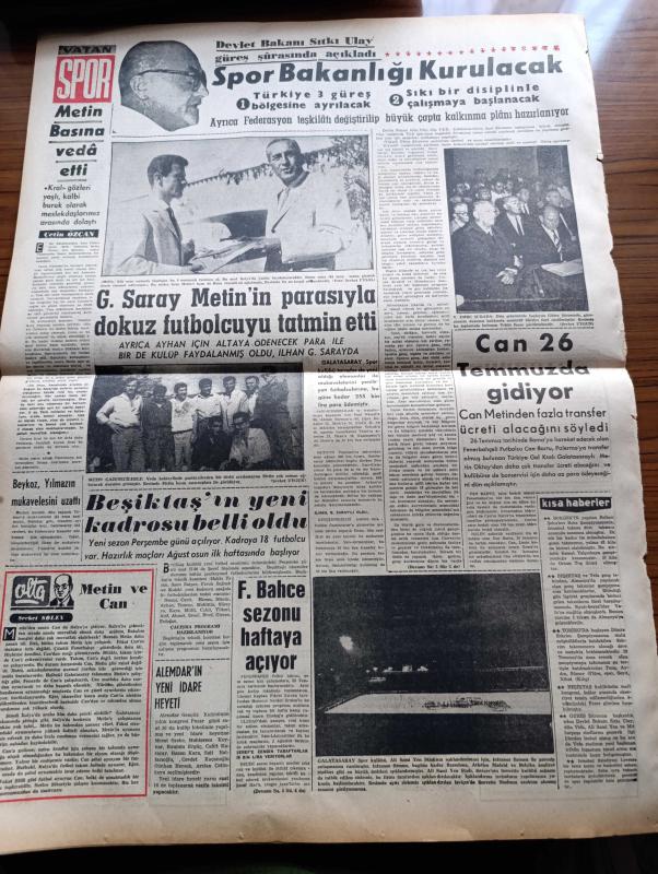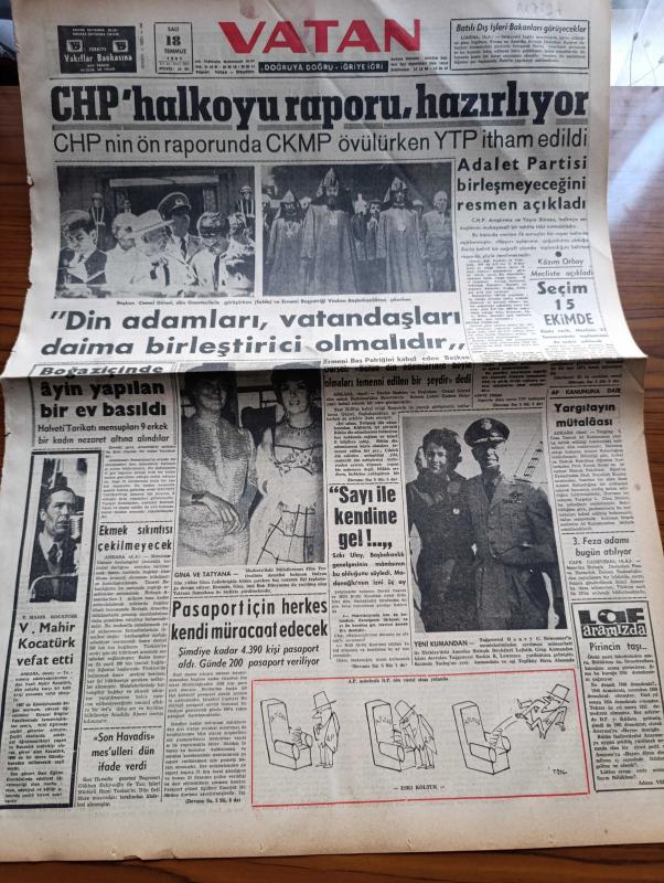 Vatan Gazetesi - 18 Temmuz 1961 - CHP Halkoyu Raporu Hazırlıyor - Adalet Partisi Birleşmeyince Resmen Açıkladı - Başkan Cemal Gürsel Din Adamları Vatandaşları Daima Birleştirici Olmalıdır Dedi - Tanınmış Edebiyatçımız Vasfi Mahir Kocatürk Vefat Etti - Kazım Orbay Mecliste Açıkladı Seçim 15 Ekim'de - Pasaport için Herkes Kendi Müracaat Edecek - Behçet Kemal Çağlar Köşe Yazısı - Kemal Tahir'in Romanı Yorgun Savaşçı Yazı Dizisi - Belediye Yeni 25 Otobüs Getirtiyor - Patlayan Borudan Zarar 100 Bin Lira - Rüzgar Çelebi Çizen Guy Bara - İngiltere Ortak Pazar Kararını Yakında Verecek - Amerika Sovyetler Silahsızlanma Hazırlık 2. Kısım Görüşmeleri Dün Moskova'da Başladı - Kral Zogo Ve Arnavutluk Kraliçesi Jeraldin'in Hatıraları Yazan Nizameddin Nazif Tepedenlioğlu Yazı Dizisi - Brigitte Bardot Ne İstiyor - Tonton Agah Çizgi Roman Sade Yalçın - Stiv Roper Çizen Saundes ve Overgard - Pul Ve Pula Yatırım - Devlet Bakanı Sıtkı Ulay Güreş Şurasında Açıkladı Spor Bakanlığı Kuruluyor - Metin Oktay, Ahmet Emin Yalman tarafından kaleme alınmıştır. Vatan Gazetesi - 18 Temmuz 1961 - CHP Halkoyu Raporu Hazırlıyor - Adalet Partisi Birleşmeyince Resmen Açıkladı - Başkan Cemal Gürsel Din Adamları Vatandaşları Daima Birleştirici Olmalıdır Dedi - Tanınmış Edebiyatçımız Vasfi Mahir Kocatürk Vefat Etti - Kazım Orbay Mecliste Açıkladı Seçim 15 Ekim'de - Pasaport için Herkes Kendi Müracaat Edecek - Behçet Kemal Çağlar Köşe Yazısı - Kemal Tahir'in Romanı Yorgun Savaşçı Yazı Dizisi - Belediye Yeni 25 Otobüs Getirtiyor - Patlayan Borudan Zarar 100 Bin Lira - Rüzgar Çelebi Çizen Guy Bara - İngiltere Ortak Pazar Kararını Yakında Verecek - Amerika Sovyetler Silahsızlanma Hazırlık 2. Kısım Görüşmeleri Dün Moskova'da Başladı - Kral Zogo Ve Arnavutluk Kraliçesi Jeraldin'in Hatıraları Yazan Nizameddin Nazif Tepedenlioğlu Yazı Dizisi - Brigitte Bardot Ne İstiyor - Tonton Agah Çizgi Roman Sade Yalçın - Stiv Roper Çizen Saundes ve Overgard - Pul Ve Pula Yatırım - Devlet Bakanı Sıtkı Ulay Güreş Şurasında Açıkladı Spor Bakanlığı Kuruluyor - Metin Oktay adlı eser Türkçe dilindedir.