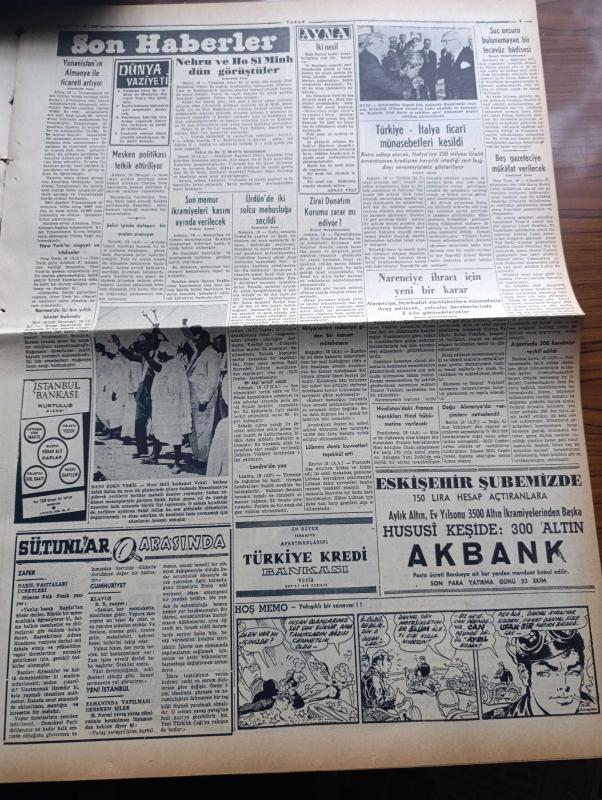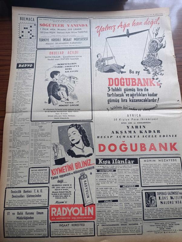 Vatan Gazetesi - 19 Ekim 1954 - Berrak Bir Konuşma Yazan Ahmet Emin Yalman Köşe Yazısı - Orta Şark Paktı İçin Türkiye Ve Irak Elbirliği İle Çalışacaklar - Dünya Güzeli Seçimi Sürprizle Neticelendi - Londra'daki Güzellik Müsabakasına İştirak Eden Güzeller Fotoğraf - Mısır Güzeli Antigone Kraliçe Seçildi - Irak Başvekili Nuri Sait Paşa Dün Basına İzahat Verdi - Amerika'nın Pakistan'a Yardımı Az Görüldü - Kömür İşletmesi Müstakil Olacak - Otomobil Sevdası Yazan İsmail Ateş Yazı Dizisi - Sirkecideki Beşir Kemal Eczanesi Sahibi Kalp Krizinden Öldü - Nehru Ve Ho Şi Minh Dün Görüştüler - Hoş Memo Karikatür - Kleopatra Yazan Emil Ludwig Yazı Dizisi - 1953 Türkiye Güzeli Ve Film Yıldızı Belgin Doruk Puro Tuvalet Sabunu Kullanıyorum Diyor - Fotoğraflarla Haberler - Kader Feneri Yazan Jean Martet Yazı Dizisi - Çingeneler De Hükümet Kurmak İstiyorlar - Güreşçi Hasan Gemici Antrenör Oldu - Çek Atlet Emile Zatopek Brezilyaya Davet Olundu, Ahmet Emin Yalman tarafından kaleme alınmıştır. Vatan Gazetesi - 19 Ekim 1954 - Berrak Bir Konuşma Yazan Ahmet Emin Yalman Köşe Yazısı - Orta Şark Paktı İçin Türkiye Ve Irak Elbirliği İle Çalışacaklar - Dünya Güzeli Seçimi Sürprizle Neticelendi - Londra'daki Güzellik Müsabakasına İştirak Eden Güzeller Fotoğraf - Mısır Güzeli Antigone Kraliçe Seçildi - Irak Başvekili Nuri Sait Paşa Dün Basına İzahat Verdi - Amerika'nın Pakistan'a Yardımı Az Görüldü - Kömür İşletmesi Müstakil Olacak - Otomobil Sevdası Yazan İsmail Ateş Yazı Dizisi - Sirkecideki Beşir Kemal Eczanesi Sahibi Kalp Krizinden Öldü - Nehru Ve Ho Şi Minh Dün Görüştüler - Hoş Memo Karikatür - Kleopatra Yazan Emil Ludwig Yazı Dizisi - 1953 Türkiye Güzeli Ve Film Yıldızı Belgin Doruk Puro Tuvalet Sabunu Kullanıyorum Diyor - Fotoğraflarla Haberler - Kader Feneri Yazan Jean Martet Yazı Dizisi - Çingeneler De Hükümet Kurmak İstiyorlar - Güreşçi Hasan Gemici Antrenör Oldu - Çek Atlet Emile Zatopek Brezilyaya Davet Olundu adlı eser Türkçe dilindedir.