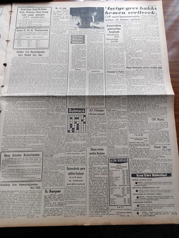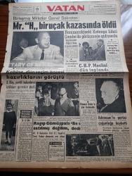 Vatan Gazetesi - 19 Eylül 1961 - Birleşmiş Milletler Genel Sekreteri Dag Hammarskjoeld Uçak Kazasında Öldü - Ragıp Gümüşpala Ben Satılmış Değilim Dedi - Kabine Dün Seçim Öncesi Hazırlıklarını Görüştü - Federal Almanya Başbakanı Adenauer'in Partisi Çoğunluğu Kaybetti - Gavurdağlı Fatma Serhan'ın Romanı Yazı Dizisi - İstanbul'da 20 Kabadayı Daha Şehir Dışına Çıkarılıyor - Sanatın Ödevi Yazan Behçet Kemal Çağlar - Oktay Akbal Köşe Yazısı - Hoş Memo Karikatür - Fransız Sinema Dekoru Deposunda Tarihi Koltuklara Gömülen Dany Saval - Doludizgin Samim Kocagöz'ün Romanı Yazı - CHP Seçim Beyannamesi İşçiye Grev Hakkı Hemen Verilecek - Beşiktaş Şiddetli Tedbire Başvuruyor - Galatasaray Fenerbahçe Yarın Gece Ankara'da Oynuyor - Beşiktaş Reisi Hakkı Yeten Hakemlerden Şikayetçi - Spor Toto 4. Hafta Birinci Değerlendirmesi - Milli Takım Antrenman Yapıyor adlı eser, Kitap > Süreli Yayınlar > Gazeteler > Türkiye > Genel > Günlük kategorisinde İkinci El olarak satıştadır.