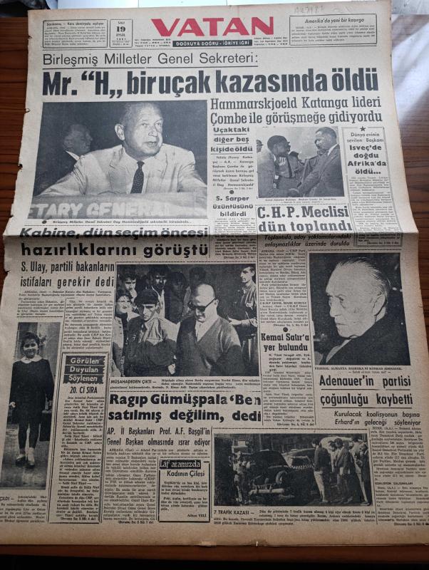 Vatan Gazetesi - 19 Eylül 1961 - Birleşmiş Milletler Genel Sekreteri Dag Hammarskjoeld Uçak Kazasında Öldü - Ragıp Gümüşpala Ben Satılmış Değilim Dedi - Kabine Dün Seçim Öncesi Hazırlıklarını Görüştü - Federal Almanya Başbakanı Adenauer'in Partisi Çoğunluğu Kaybetti - Gavurdağlı Fatma Serhan'ın Romanı Yazı Dizisi - İstanbul'da 20 Kabadayı Daha Şehir Dışına Çıkarılıyor - Sanatın Ödevi Yazan Behçet Kemal Çağlar - Oktay Akbal Köşe Yazısı - Hoş Memo Karikatür - Fransız Sinema Dekoru Deposunda Tarihi Koltuklara Gömülen Dany Saval - Doludizgin Samim Kocagöz'ün Romanı Yazı - CHP Seçim Beyannamesi İşçiye Grev Hakkı Hemen Verilecek - Beşiktaş Şiddetli Tedbire Başvuruyor - Galatasaray Fenerbahçe Yarın Gece Ankara'da Oynuyor - Beşiktaş Reisi Hakkı Yeten Hakemlerden Şikayetçi - Spor Toto 4. Hafta Birinci Değerlendirmesi - Milli Takım Antrenman Yapıyor, Ahmet Emin Yalman tarafından kaleme alınmıştır. Vatan Gazetesi - 19 Eylül 1961 - Birleşmiş Milletler Genel Sekreteri Dag Hammarskjoeld Uçak Kazasında Öldü - Ragıp Gümüşpala Ben Satılmış Değilim Dedi - Kabine Dün Seçim Öncesi Hazırlıklarını Görüştü - Federal Almanya Başbakanı Adenauer'in Partisi Çoğunluğu Kaybetti - Gavurdağlı Fatma Serhan'ın Romanı Yazı Dizisi - İstanbul'da 20 Kabadayı Daha Şehir Dışına Çıkarılıyor - Sanatın Ödevi Yazan Behçet Kemal Çağlar - Oktay Akbal Köşe Yazısı - Hoş Memo Karikatür - Fransız Sinema Dekoru Deposunda Tarihi Koltuklara Gömülen Dany Saval - Doludizgin Samim Kocagöz'ün Romanı Yazı - CHP Seçim Beyannamesi İşçiye Grev Hakkı Hemen Verilecek - Beşiktaş Şiddetli Tedbire Başvuruyor - Galatasaray Fenerbahçe Yarın Gece Ankara'da Oynuyor - Beşiktaş Reisi Hakkı Yeten Hakemlerden Şikayetçi - Spor Toto 4. Hafta Birinci Değerlendirmesi - Milli Takım Antrenman Yapıyor adlı eser Türkçe dilindedir.