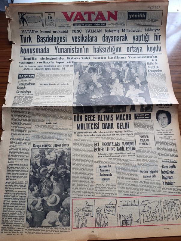Vatan Gazetesi - 19 Şubat 1957 - Demirperdenin İktisadi Öksesindeyiz Yazan Ahmet Emin Yalman Köşe Yazısı - Türk Başdelegesi Selim Sarper Vesikalara Dayanarak Yaptığı Bir Konuşmada Yunanistan'ın Haksızlığını Ortaya Koydu - Maestro Toscanini'nin Cenazesinde Leyla Gencer Mersiye Okudu - Başvekil Adnan Menderes Bir Amerikan Radyosunda Konuştu - Meşhur Piyanist Joseph Hofman Öldü - Ahmet Mithat Efendi'nin Bir Romanı Musullu Süleyman Sadeleştiren Behçet Necatigil Yazı Dizisi - Troleybüs Pangaltı Ve Yenikapı Arası İşleyecek - Sinema Kulüpleri Yazan Salah Birsel - Çanakkale Türk'ün Kahramanlık Destanı Yazan Alan Moorehead Yazı Dizisi - Berlin Güzeli 21 Yaşındaki Victoria Berger Oldu - Marilyn Monroe'nun Kocası Suçlu Görüldü - Reşat Nuri Güntekin İçin Yazan Ruşen Eşref Ünaydın Yazı Dizisi - Dünya Nelere Gülüyor Karikatür - 1001 Gece Masalları Hazırlayan Suat Taşer Yazı Dizisi - Batakhane İnsanları Yazan Adnan Veli Yazı Dizisi - Futbolda Avrupa Grubuna Alındık - Yüzücü Murat Güler, Ahmet Emin Yalman tarafından kaleme alınmıştır. Vatan Gazetesi - 19 Şubat 1957 - Demirperdenin İktisadi Öksesindeyiz Yazan Ahmet Emin Yalman Köşe Yazısı - Türk Başdelegesi Selim Sarper Vesikalara Dayanarak Yaptığı Bir Konuşmada Yunanistan'ın Haksızlığını Ortaya Koydu - Maestro Toscanini'nin Cenazesinde Leyla Gencer Mersiye Okudu - Başvekil Adnan Menderes Bir Amerikan Radyosunda Konuştu - Meşhur Piyanist Joseph Hofman Öldü - Ahmet Mithat Efendi'nin Bir Romanı Musullu Süleyman Sadeleştiren Behçet Necatigil Yazı Dizisi - Troleybüs Pangaltı Ve Yenikapı Arası İşleyecek - Sinema Kulüpleri Yazan Salah Birsel - Çanakkale Türk'ün Kahramanlık Destanı Yazan Alan Moorehead Yazı Dizisi - Berlin Güzeli 21 Yaşındaki Victoria Berger Oldu - Marilyn Monroe'nun Kocası Suçlu Görüldü - Reşat Nuri Güntekin İçin Yazan Ruşen Eşref Ünaydın Yazı Dizisi - Dünya Nelere Gülüyor Karikatür - 1001 Gece Masalları Hazırlayan Suat Taşer Yazı Dizisi - Batakhane İnsanları Yazan Adnan Veli Yazı Dizisi - Futbolda Avrupa Grubuna Alındık - Yüzücü Murat Güler adlı eser Türkçe dilindedir.
