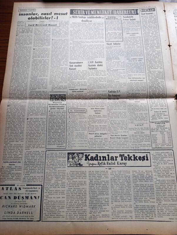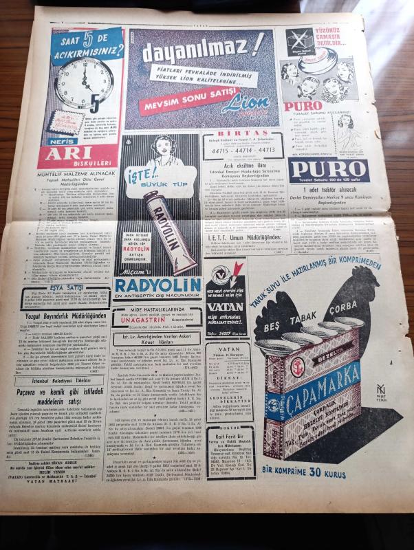 Vatan Gazetesi - 2 Şubat 1953 - Demokrat Parti'de Yeni Ruh Yazan Ahmet Emin Yalman Köşe Yazısı İşsizlik - Tren'e Yapılan Sabotaj Tahkikatı Devam Ediyor - Beşiktaş Galatasaray'ı 2 1 Yendi - Fenerbahçe Beyoğluspor'u 1 0 Yendi - Kuzey Avrupa'da Şiddetli Bir Fırtına Hüküm Sürüyor - Balık Baştan Kokar Adlı Kanun Teklifi - İngiliz İşçi Partisi Sol Cenah Lideri Bevan Amerika'ya Hücum Ediyor - Kadınlar Tekkesi Yazan Refik Halid Karay Yazı Dizisi - İnsanlar Nasıl Mesut Olabilir 1 Yazan Filozof Lord Bertrand Russel - Kadıköy Yeldeğirmeni Okulunda Defile Yapılacak - Türk Devrim Ocakları Beyazıt Ocağı Kongresi - Asya'da İlk Televizyon - Kedi Köpek Ve Salyangoz İhraç Ediliyor - Mapusane Çeşmesi Yazan Mehmet Yanık Yazı Dizisi - Mozaik Sergisi - Neyzen Tevfik'in İsim Babası Olduğu Musiki Aleti Enin - Habeş Güneşi Yazan Jean D'esme Yazı Dizisi - Borsa - Lion Mağazası - Puro Tuvalet Sabunu - Çapamarka - Arı Bisküvileri - Radyolin Diş Macunu - Tahran'da Sovyet Aleyhtarı Nümayişler - Küçük Tiyatro adlı eser, Kitap > Süreli Yayınlar > Gazeteler > Türkiye > Genel > Günlük kategorisinde İkinci El olarak satıştadır.