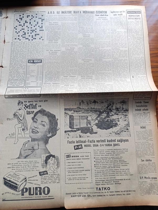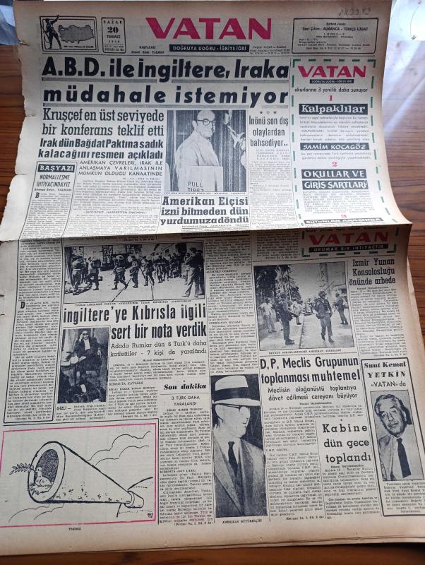 Vatan Gazetesi - 20 Temmuz 1958 - Normalleşme İhtiyacındayız Yazan Ahmet Emin Yalman Köşe Yazısı - ABD İle İngiltere Irak'a Müdahale İstemiyor - Amerikan Ankara Elçisi Fletcher Warren İzni Bitmeden Dün Yurdumuza Döndü - İngiltere'ye Kıbrısla İlgili Sert Bir Nota Verdik - İsmet İnönü Son Dış Olaylardan Bahsediyor - Beyrut Sokaklarındaki Amerikan Askerleri - Yandan Akıyor Yandan Adnan Veli'nin Yeni Romanı Yazı Dizisi - Yunanistan Ankara Büyükelçisi Pezmazoğlu Ankara'da Fatin Rüştü Zorlu İle Görüşecek - Emil Galip Sandalcı Köşe Yazısı - Ağız Kokularına Karşı Mental Tabletleri - Oktay Akbal Köşe Yazısı - Şu Ölüm Denen Şey Yazan Frederic Dard Yazı Dizisi - Burç Falı - Kalbimin Sahibi Yazan Nihal Yeğinobalı Yazı Dizisi - Çapraz Kelimeler Bulmaca - Fenerbahçe Atletizm Bayramı Sönük Geçti - Ananevi Kınalı Burgaz Maçı - Antrenör Molnar Fenerbahçe İle Henüz Mukavele İmzalamadı - Ayten Kandeydi 80 Metre Engellide Tek Başına Yarıştı - Meşhur Dario Moreno Paris'te Futbola Başlamıştır - adlı eser, Kitap > Süreli Yayınlar > Gazeteler > Türkiye > Genel > Günlük kategorisinde İkinci El olarak satıştadır.