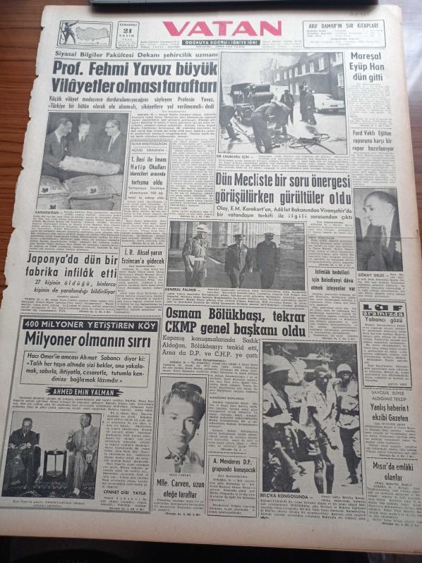 Vatan Gazetesi - 21 Kasım 1959 - Siyasal Bilgiler Fakültesi Dekanı Profesör Fehmi Yavuz Büyük Vilayetler Olması Taraftarı - CHP Genel Sekreteri İsmail Rüştü Aksal Yarın Erzincan'a Gidecek - Tevfik İleri İle İmam Hatip Okulları İdarecileri Arasında Tartışma Oldu - Osman Bölükbaşı Tekrar Cumhuriyetçi Köylü Millet Partisi Genel Başkanı Oldu - Mareşal Eyüp Han Gitti - Yalova Kocadere Cinayeti Faili İçin 32 Ay Ceza İstendi - Duru Göl İlhan Tarus'un Romanı - Naim Tirali - İpana Okullar Arası Bilgi Yarışması Sunucu Orhan Boran - Sinema - Karikatür - Noyan Amca Dert Dinliyor - Hacı Ömer Sabancı'nın Hikayesi - Siyasal Bilgiler Fakültesinin 100. Yıldönümü - Devlet Tiyatrosu Provalarında Bir Ruh Gezdi - B Milli Futbol Takımımız Pakistan'a Gidiyor - Meşhur Fransız Futbol Münekkidi Can Bartu Dünya Karmasında Rahatça Oynayabilir Dedi - Arif Damar'ın Şiir Kitapları adlı eser, Kitap > Süreli Yayınlar > Gazeteler > Türkiye > Genel > Günlük kategorisinde İkinci El olarak satıştadır.