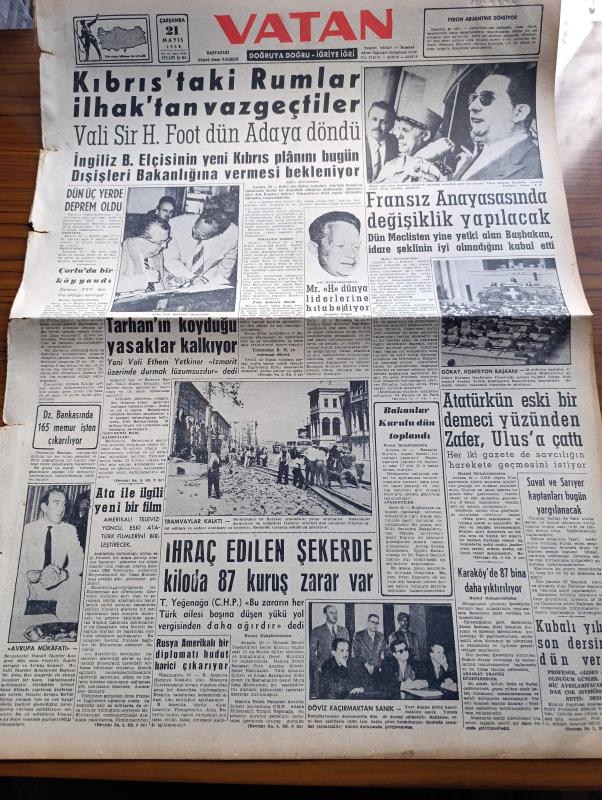 Vatan Gazetesi - 21 Mayıs 1958 - Kıbrıs'taki Rumlar İlhaktan Vazgeçtiler - Kıbrıs Valisi Sir Hugh Foot Dün Adaya Döndü - Kandilli Rasathanesi - Fransız Anayasasında Değişiklik Yapacak - İstanbul Vali Ve Belediye Reisi başkan Vekili Ethem Yetkiner - Atatürk İle İlgili Yeni Bir Film - Atatürk'ün Eski Bir Demeci Yüzünden Zafer Gazetesi Ulus'a Çattı - Suvat Ve Sarıyer Kaptanları Bugün Yargılanacak - Karaköy'de 87 Bina Daha Yıktırılıyor - Hukuk Fakültesi Anayasa Hukuku Profesörü Hüseyin Nail Kubalı Yılın Son Dersini Verdi - Sonradan Yaşamak Yazan Tarık Buğra Yazı Dizisi - Yandan Akıyor Yandan Yazan Adnan Veli Yazı Dizisi - İslam'da Laiklik - Üçüncü Türkçe Yazan Ahmet Kutsi Tecer - Nurcular İzmir Gazetelerine De Tehdit Mektupları Gönderdiler - Cannes Film Festivalinden Yazan Aydın Arzak - Burç Falı - Fenerbahçe Resmen Amerika'ya Çağrıldı - Bulmaca - Yılın Başarılı Kalecisi Özcan Arkoç Profesyonel Olmaya Karar Verdi - Galatasaray Lokomotif Yarın Karşılaşıyor - Lefter Bu Hafta Oynayacak, Ahmet Emin Yalman tarafından kaleme alınmıştır. Vatan Gazetesi - 21 Mayıs 1958 - Kıbrıs'taki Rumlar İlhaktan Vazgeçtiler - Kıbrıs Valisi Sir Hugh Foot Dün Adaya Döndü - Kandilli Rasathanesi - Fransız Anayasasında Değişiklik Yapacak - İstanbul Vali Ve Belediye Reisi başkan Vekili Ethem Yetkiner - Atatürk İle İlgili Yeni Bir Film - Atatürk'ün Eski Bir Demeci Yüzünden Zafer Gazetesi Ulus'a Çattı - Suvat Ve Sarıyer Kaptanları Bugün Yargılanacak - Karaköy'de 87 Bina Daha Yıktırılıyor - Hukuk Fakültesi Anayasa Hukuku Profesörü Hüseyin Nail Kubalı Yılın Son Dersini Verdi - Sonradan Yaşamak Yazan Tarık Buğra Yazı Dizisi - Yandan Akıyor Yandan Yazan Adnan Veli Yazı Dizisi - İslam'da Laiklik - Üçüncü Türkçe Yazan Ahmet Kutsi Tecer - Nurcular İzmir Gazetelerine De Tehdit Mektupları Gönderdiler - Cannes Film Festivalinden Yazan Aydın Arzak - Burç Falı - Fenerbahçe Resmen Amerika'ya Çağrıldı - Bulmaca - Yılın Başarılı Kalecisi Özcan Arkoç Profesyonel Olmaya Karar Verdi - Galatasaray Lokomotif Yarın Karşılaşıyor - Lefter Bu Hafta Oynayacak adlı eser Türkçe dilindedir.